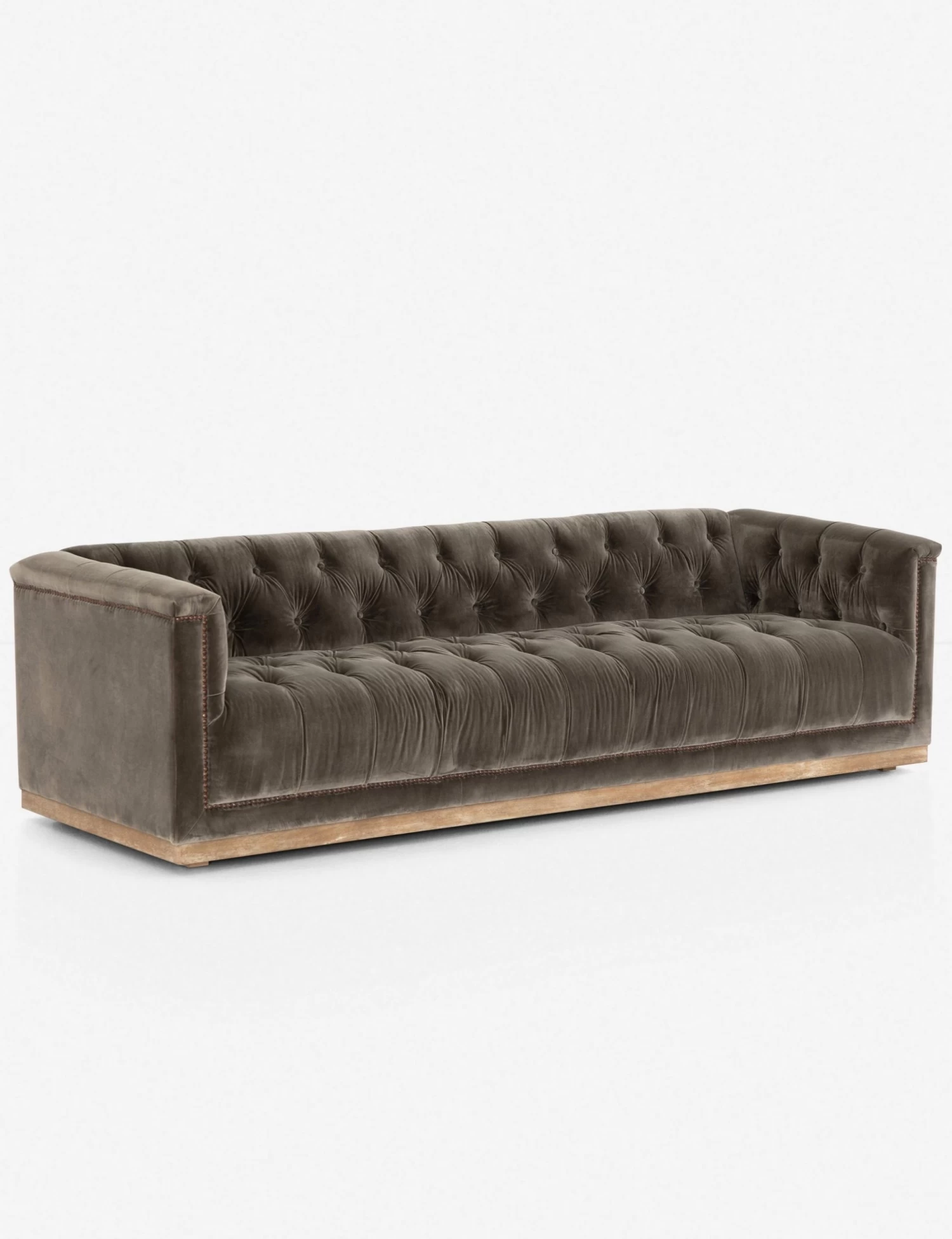 This tufted velvet sofa with aged bronze nailhead details gives a traditional library feel while the rectangular wood base gives it a modern and elevated edge. We love styling it with mid-century pieces and industrial accents for a layered look.