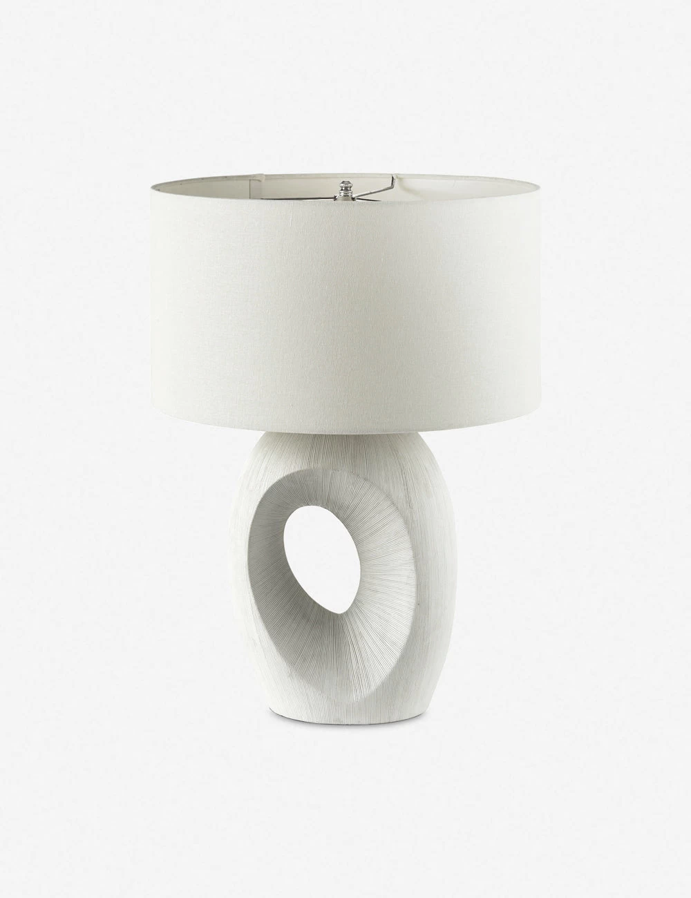 Sculptural lines and a cutout silhouette bring organic appeal to this table lamp. The diffused light of the drum shade beautifully highlights the lamp’s crisp form—creating an elevating addition for any console or end table.
