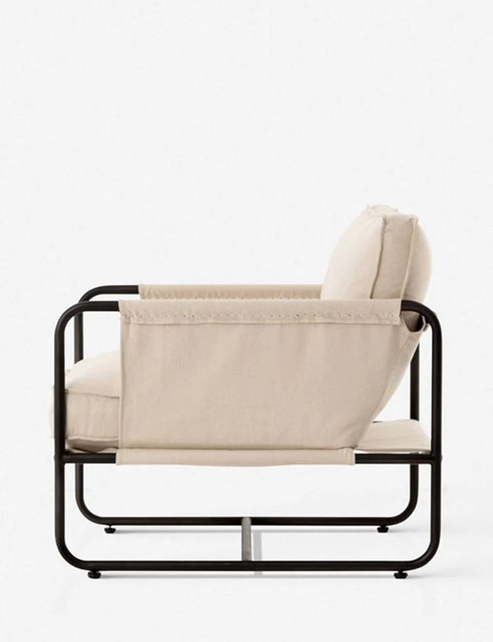Relax in style with the Alena chair. The black metal frame contrasts with cream linen cushions for a look that’s both inviting and industrial-chic.