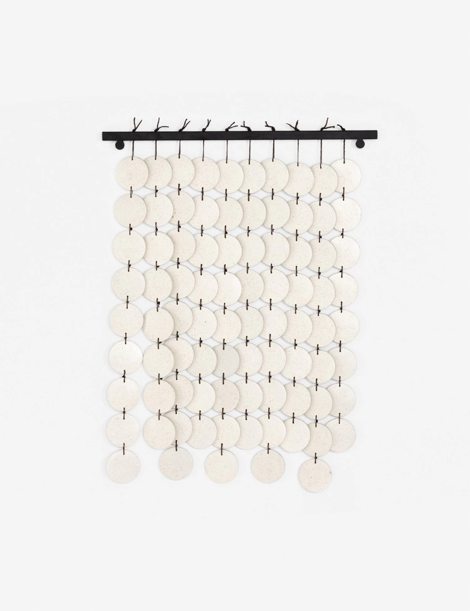 Simple elements are fashioned into a textural piece of wall art in this artisanal feature. A pleasing arrangement of layered cream ceramic disks hang from a slim black frame to offer a tactile dimension for a collected décor. Style this wall hanging with sculptural accents and natural woods for a laid-back, transitional space.