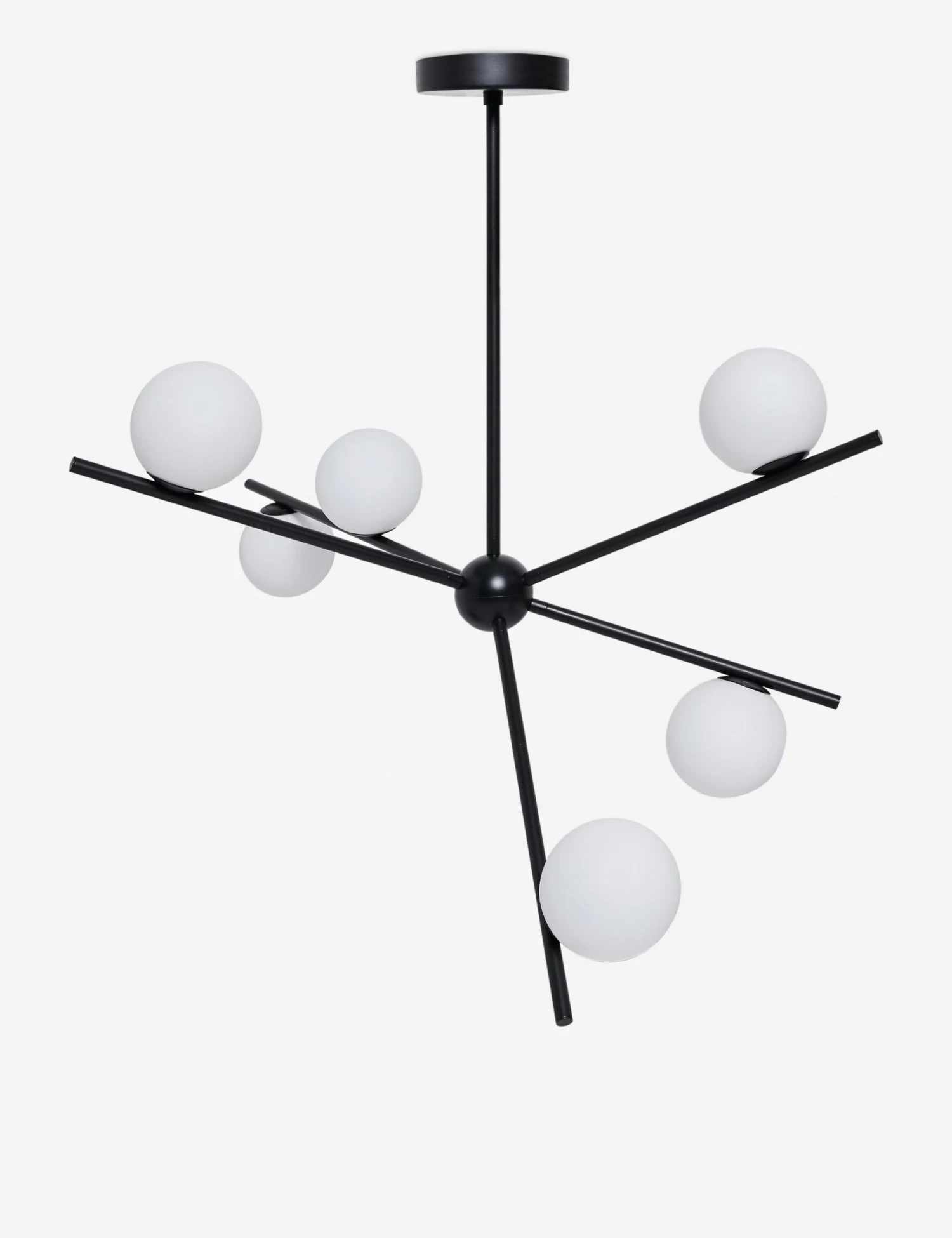 Our Alfaro chandelier brings an artful poise to statement lighting. Its six globes sit perched on a sleek frame—floating in a playfully asymmetric arrangement. This modern chandelier is an overhead tone-setter for a glamorous curation.