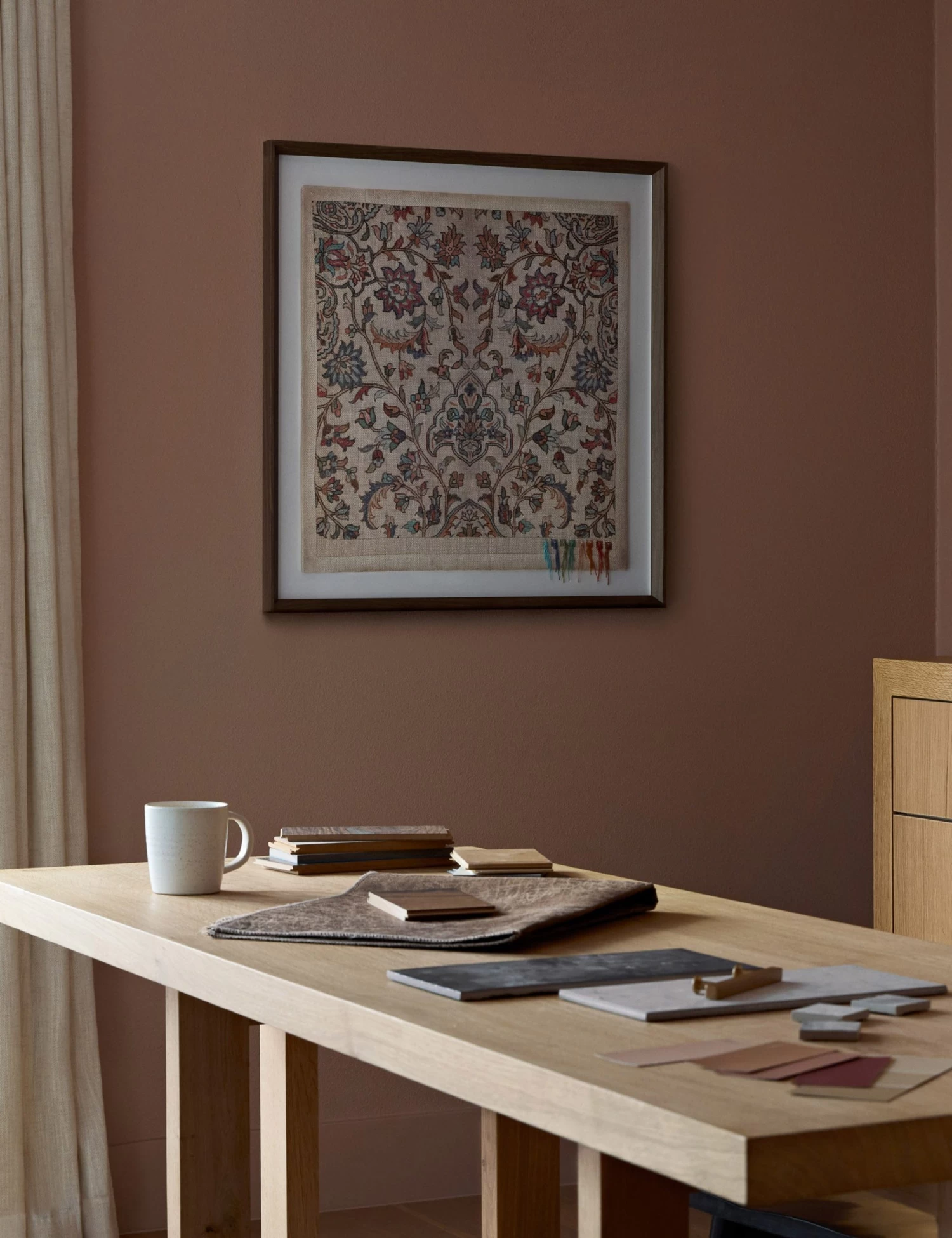 Elevate your wall decor with a classic touch. This textile art features ornate motifs in a vibrant palette, offering a bold floral expression that can fit in traditional and transitional curations alike. The small square frame is perfect for a bedroom or formal sitting area.