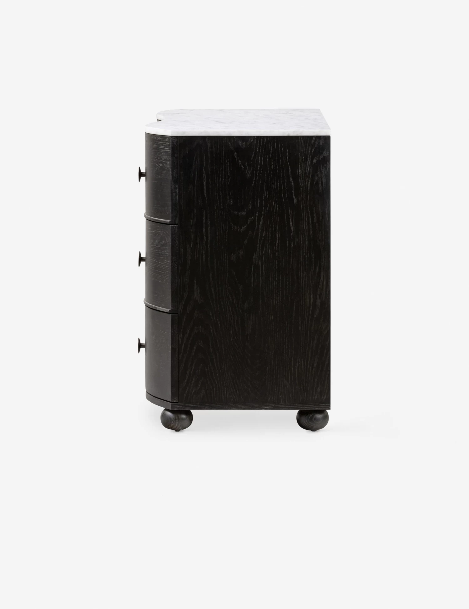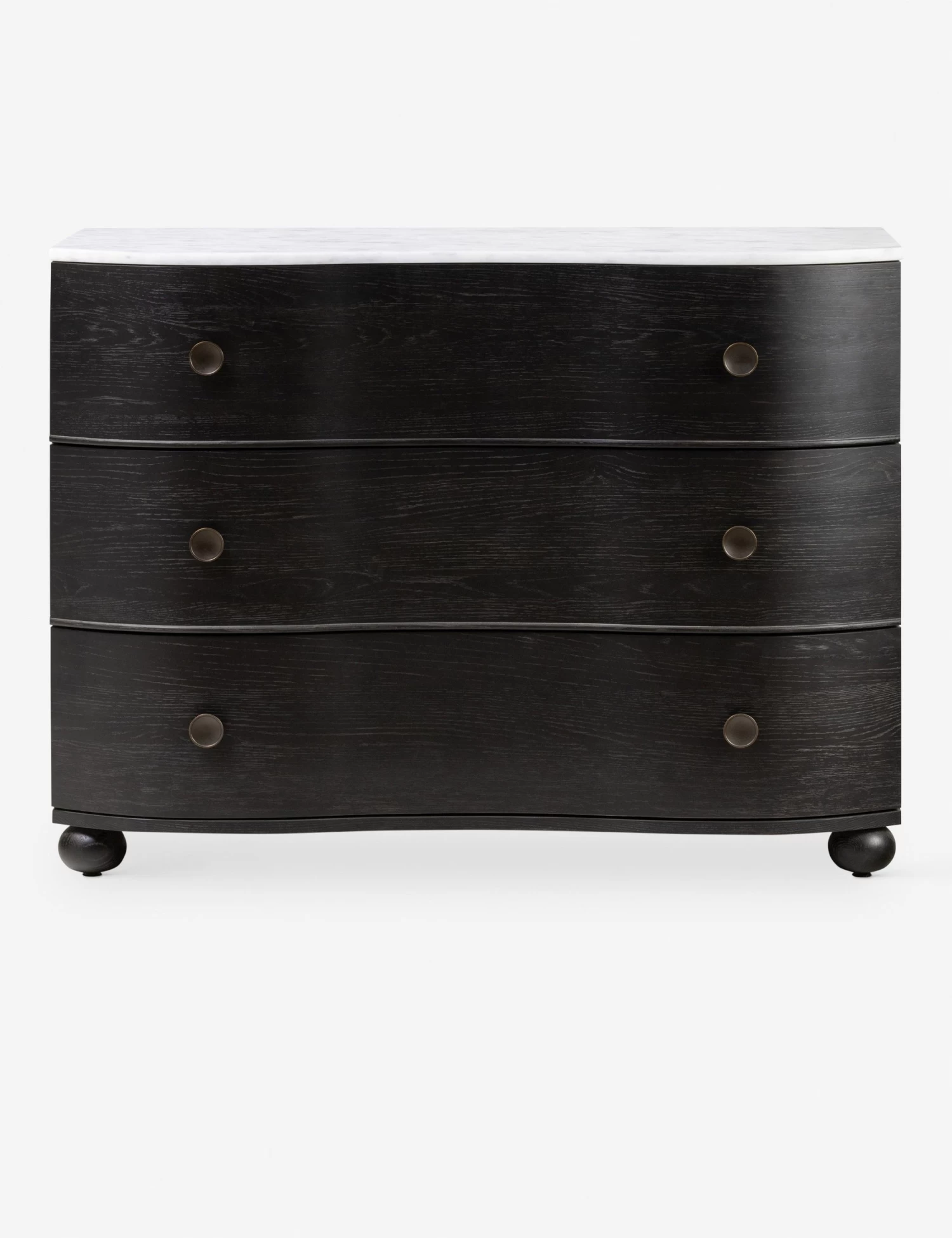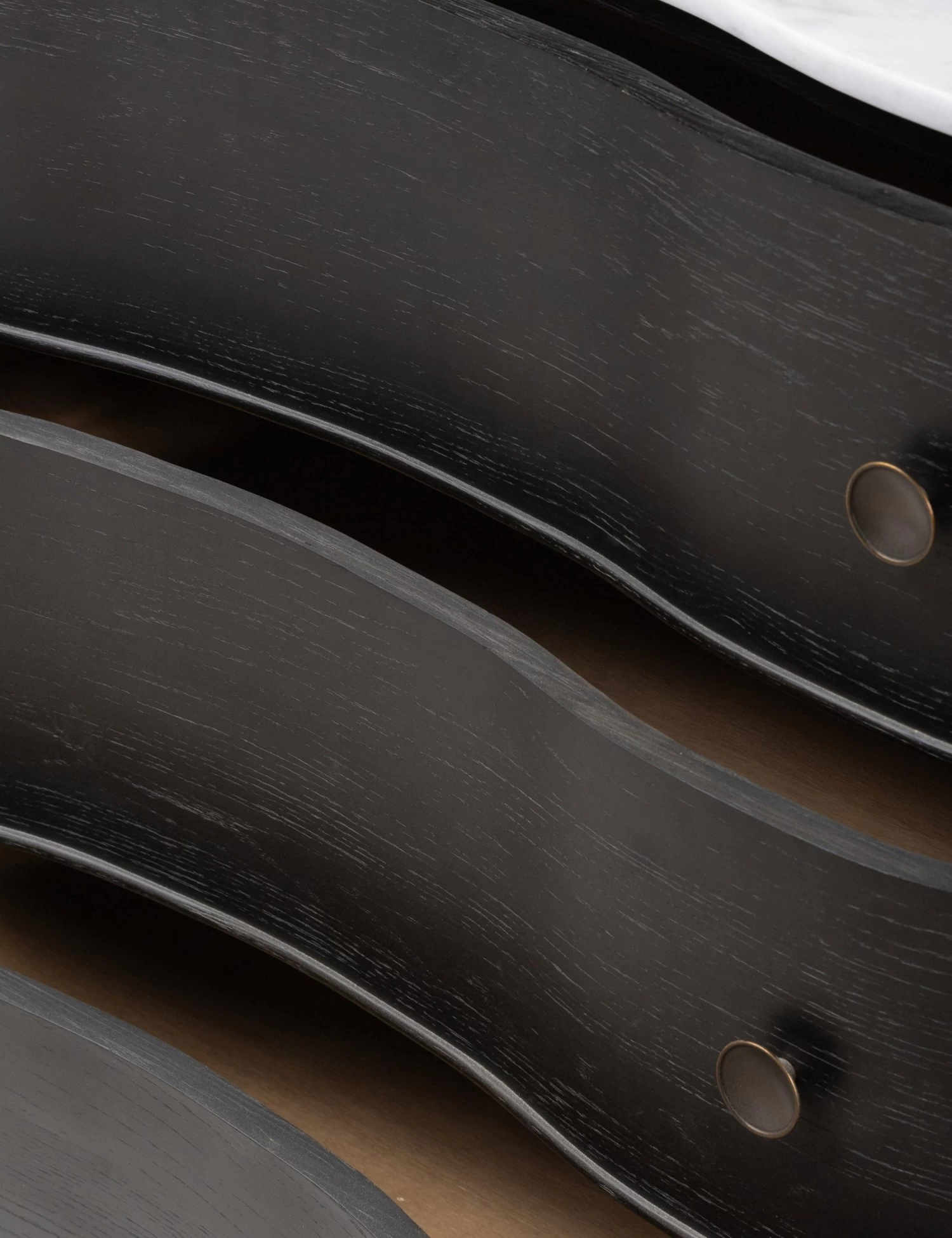 The Amherst dresser takes notes from antique European styles and brings them to life in a luxe mixed material design. A white marble slab sits atop the oak-clad frame, featuring three spacious drawers. Round metal pulls complete the look with a touch of luster.