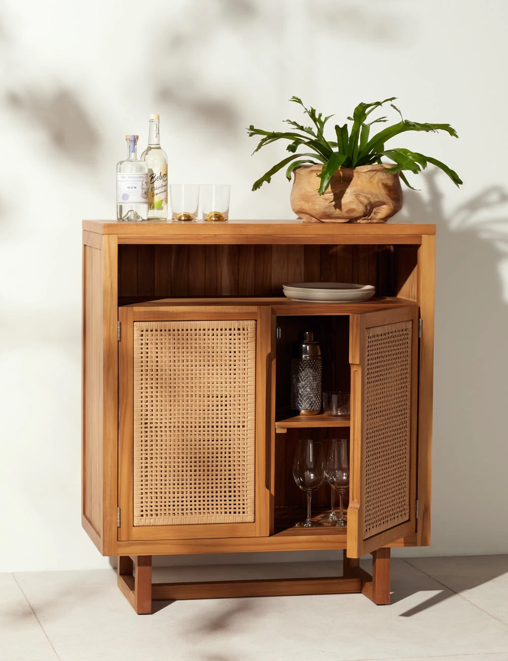 Inspire a space that feels elevated yet timelessly casual with this versatile indoor/outdoor collection. A teak frame with an open shelf and all-weather wicker doors offer an effortless appeal to the Anson cabinet. Add this storage cabinet to a patio or sunroom lounge for a practical touch of storage.
