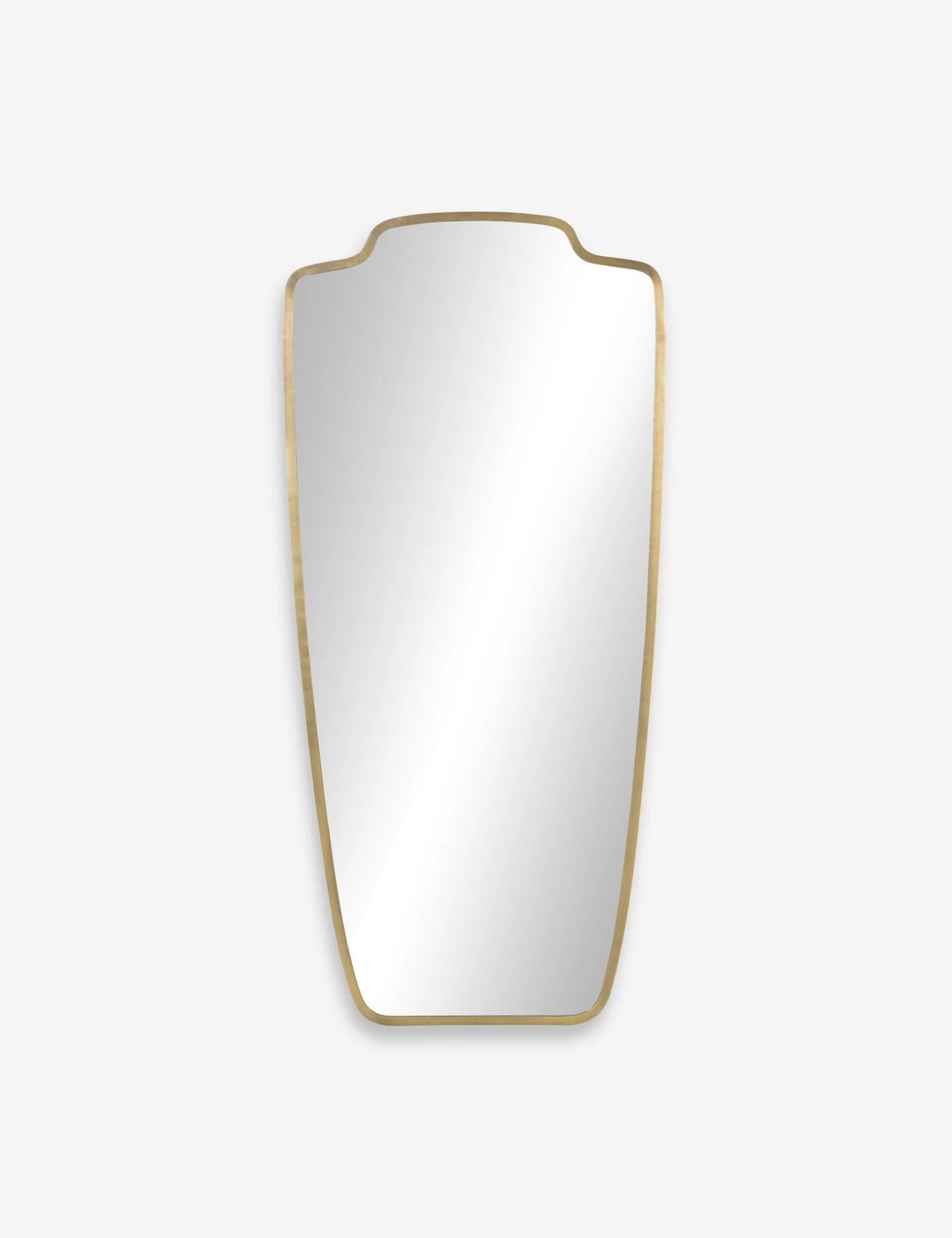 Sculptural yet understated, this full-length mirror features a distinctive crest-shaped silhouette with softly rounded corners. The slim brass-finished frame lends warmth and quiet elegance without overwhelming the space. Perfect for style checks or simply reflecting the light, it brings height and polish to bedrooms, dressing areas, or hallways.