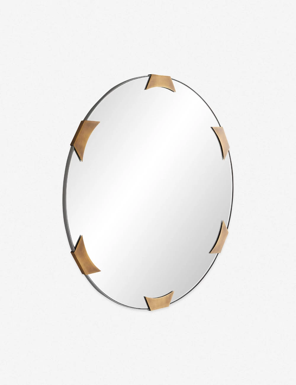 Transitional design gets a modern edge in this wall mirror. The blackened iron frame is fitted with antique brass clasps for a dramatic flair. Style this round mirror for an effortless touch of sophistication.