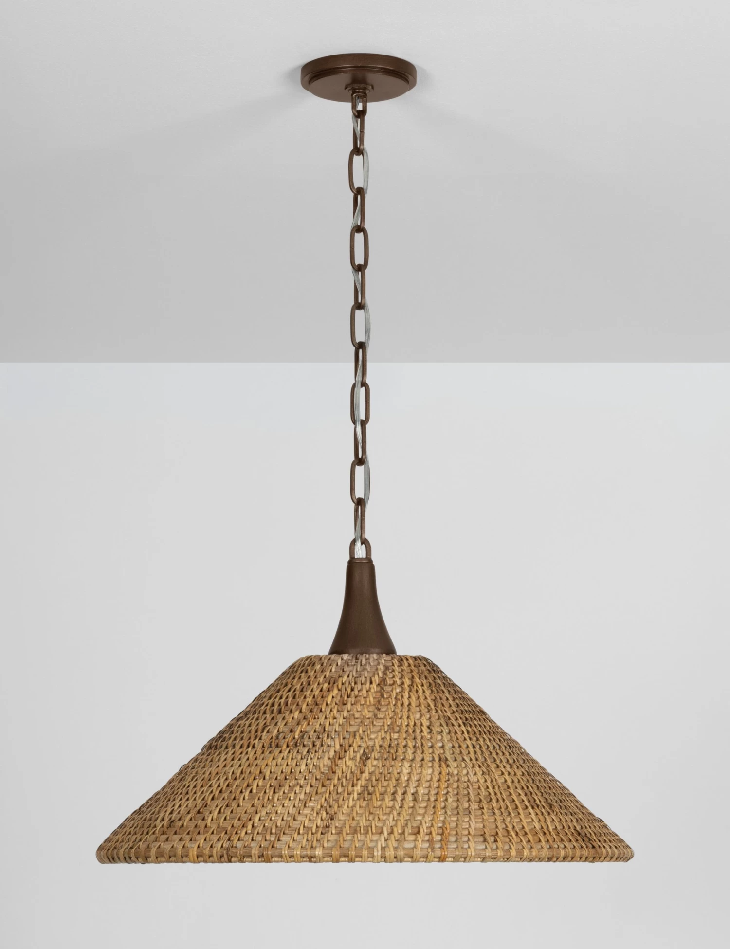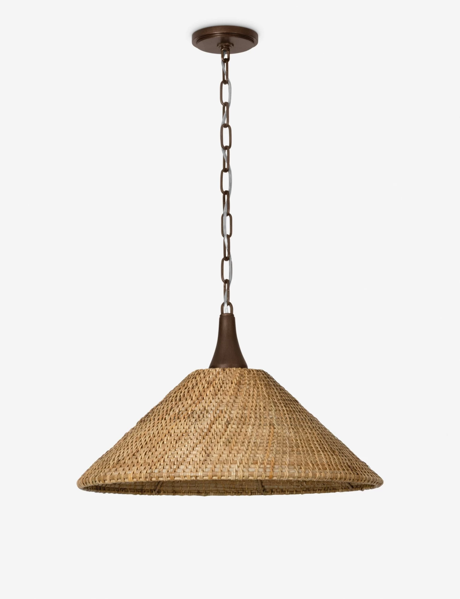 The Astyn pendant brings a fresh dimension to natural material design. Diagonally woven wicker wraps the tapered form, filtering light with rich texture. We love this rattan ceiling light for small kitchens and layered living spaces alike.