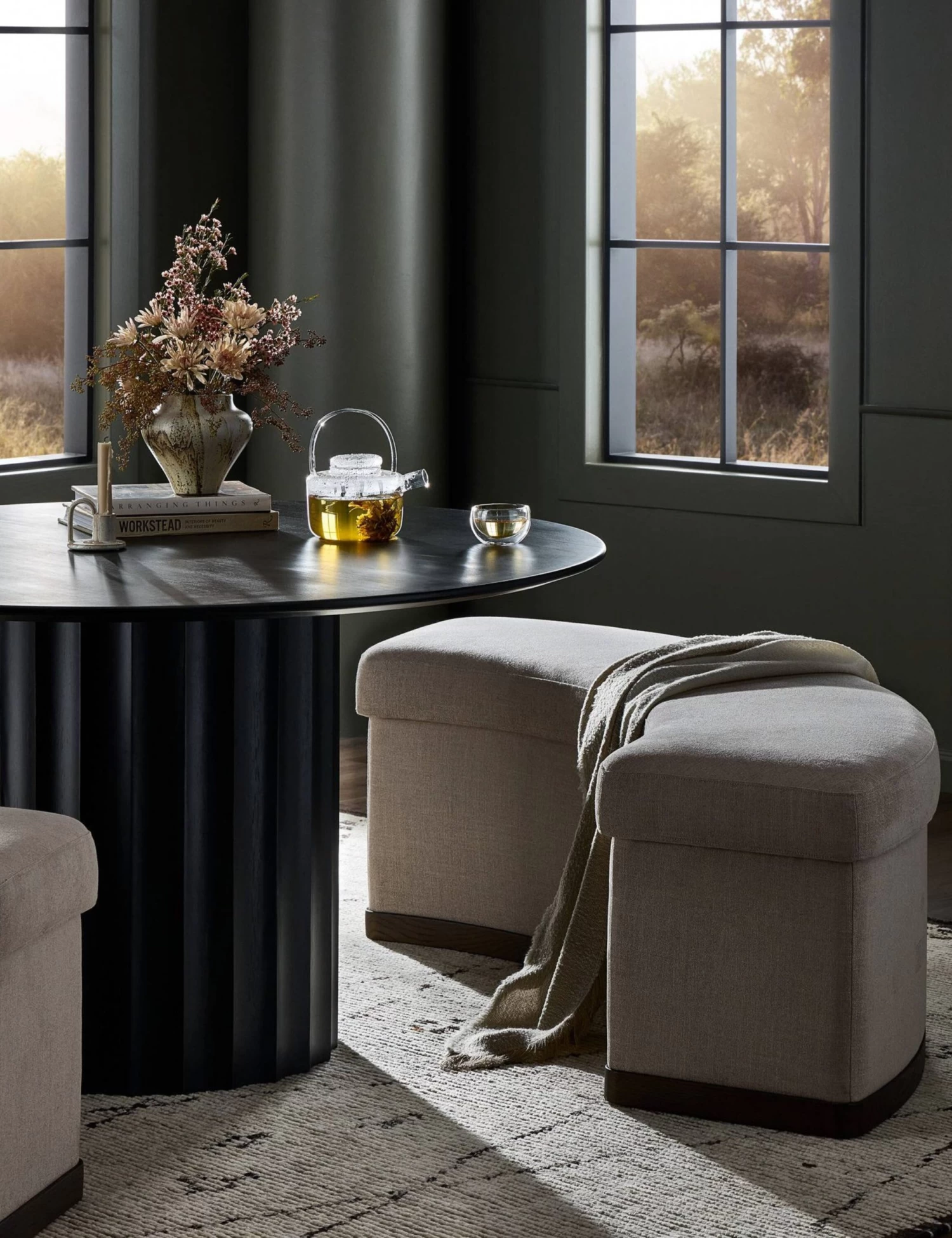 An arched silhouette and tailored lines give this upholstered dining bench an elegant feel. Upholstered in performance fabric, it’s made to elevate an everyday space with lasting style. A dark wood plinth base adds contrast and structure, grounding the design with a sophisticated finish.