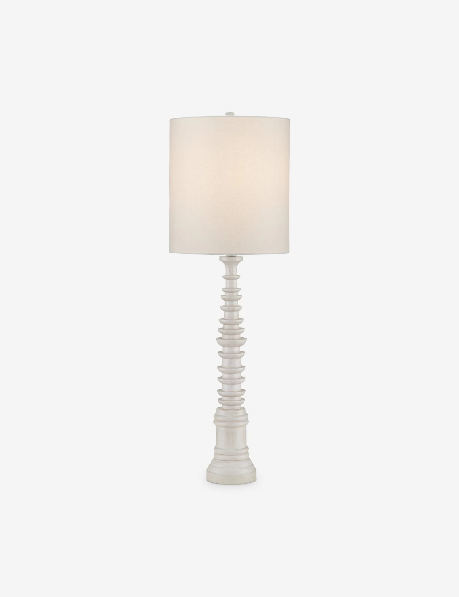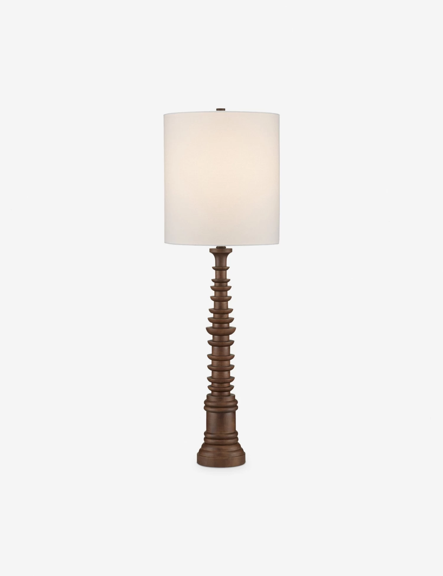Add a touch of drama to the room with this sculptural lamp. The intricate form catches the eye with its tapered column decked in woodwork details. This table lamp offers the perfect touch of light and a grounding presence with its sturdy, rhythmic design and tall linen shade.