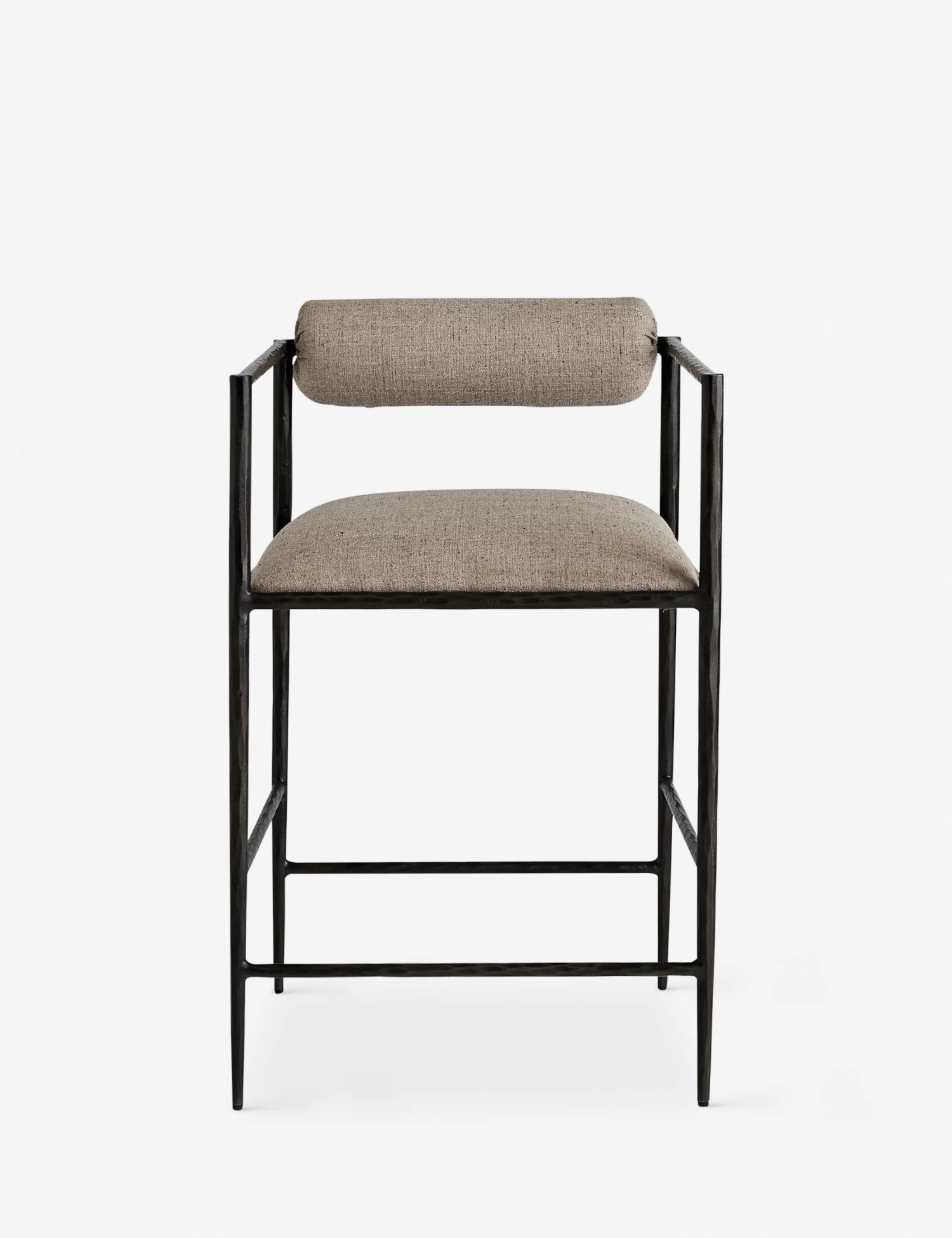 Natural hammered iron brings an industrial look to this simple yet sophisticated counter-height stool. Tapered legs offer an edgier touch, while the upholstered bolster back lends a more elegant air.