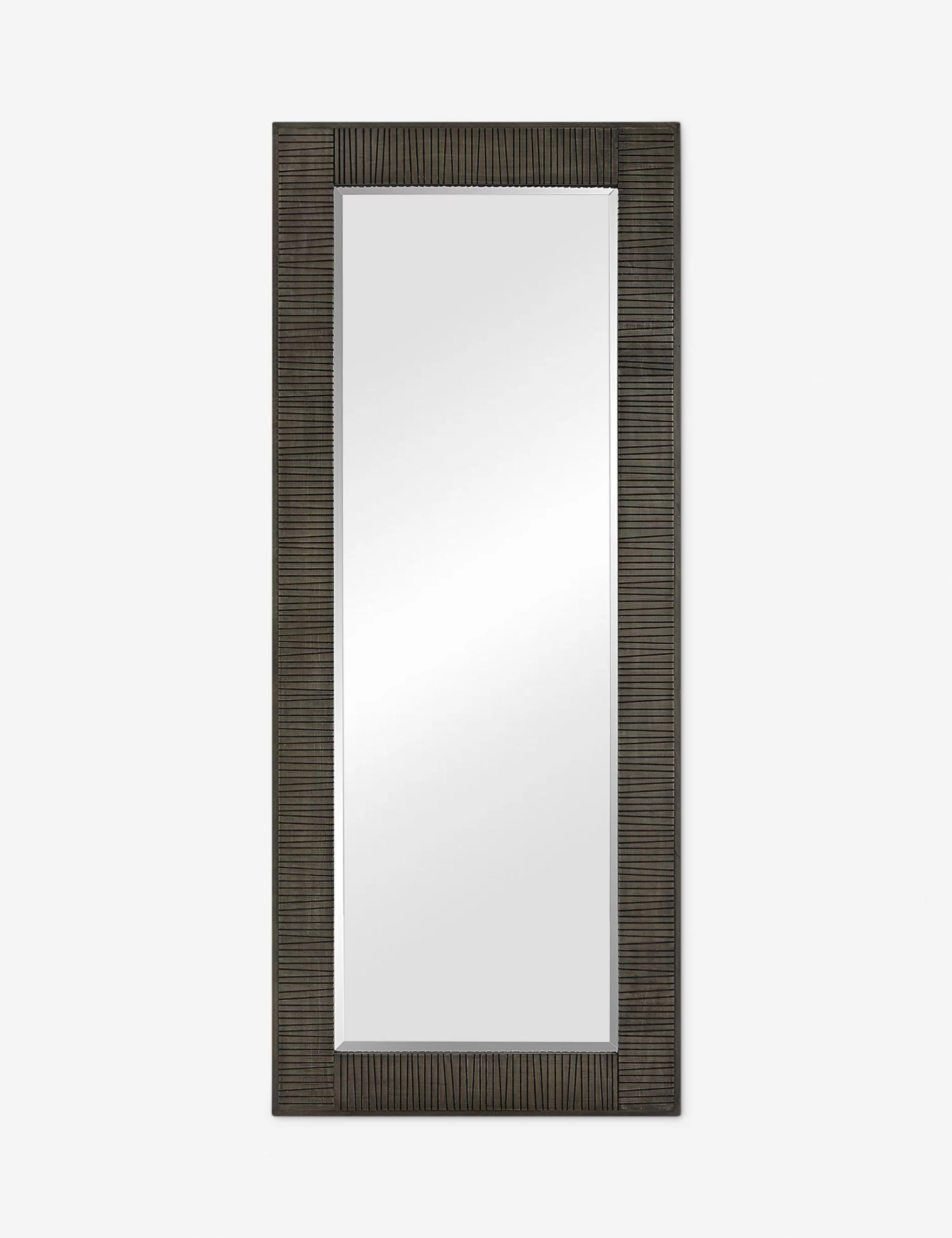 Hand-carved channels bring a striking textural look to this oversized full-length mirror. Its gray wash on wood offers a rustic warmth to the modern design, styling the perfect decorative mirror for a transitional entryway or living room.