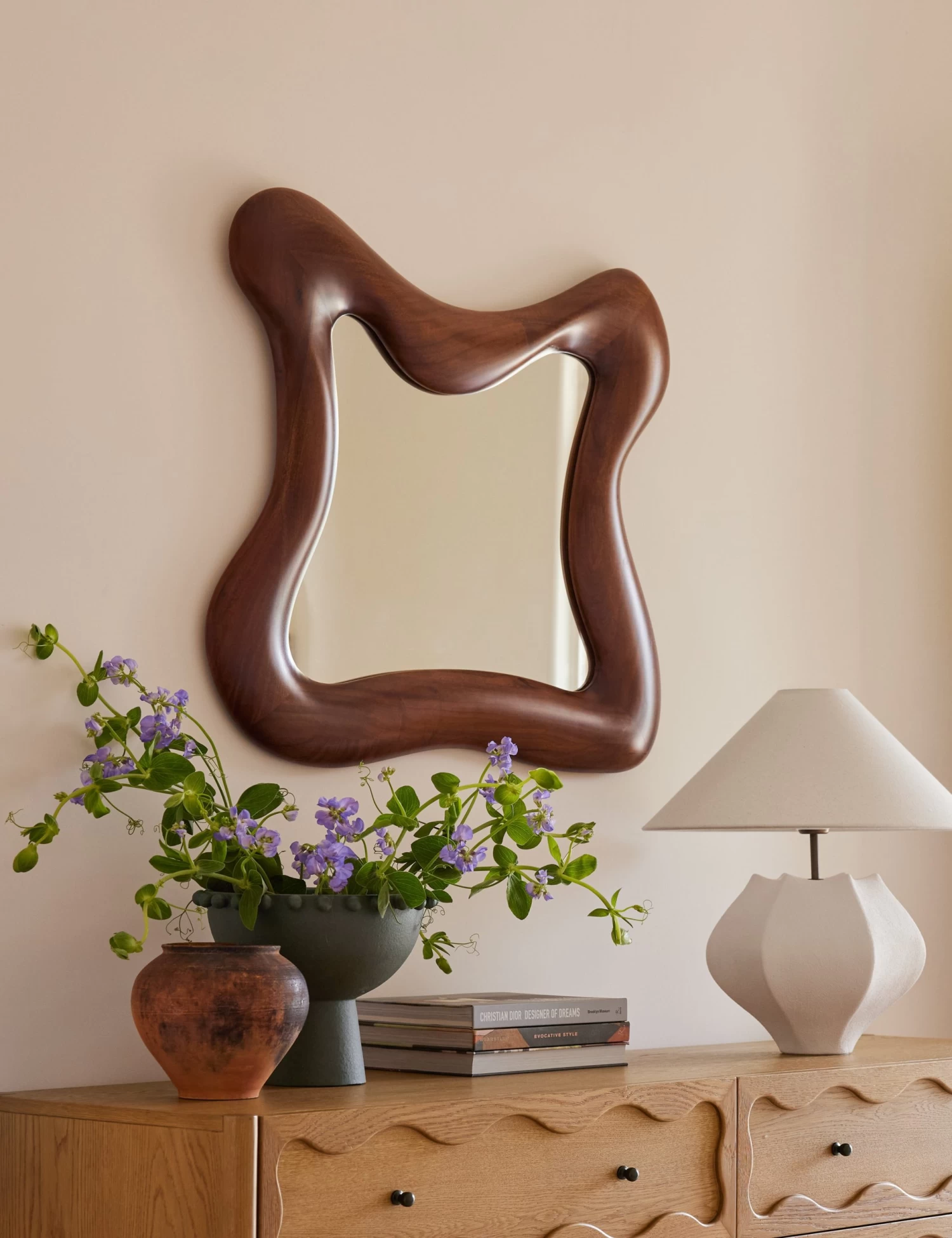 In this exclusive collection, Aimee Song brings her beloved fashion sense home with artful elements designed for living. The Cambria mirror strikes statement appeal on your wall with its chunky wood frame outlining a dramatic silhouette. The soft lines and polished natural grain texture ground the design in organic warmth.