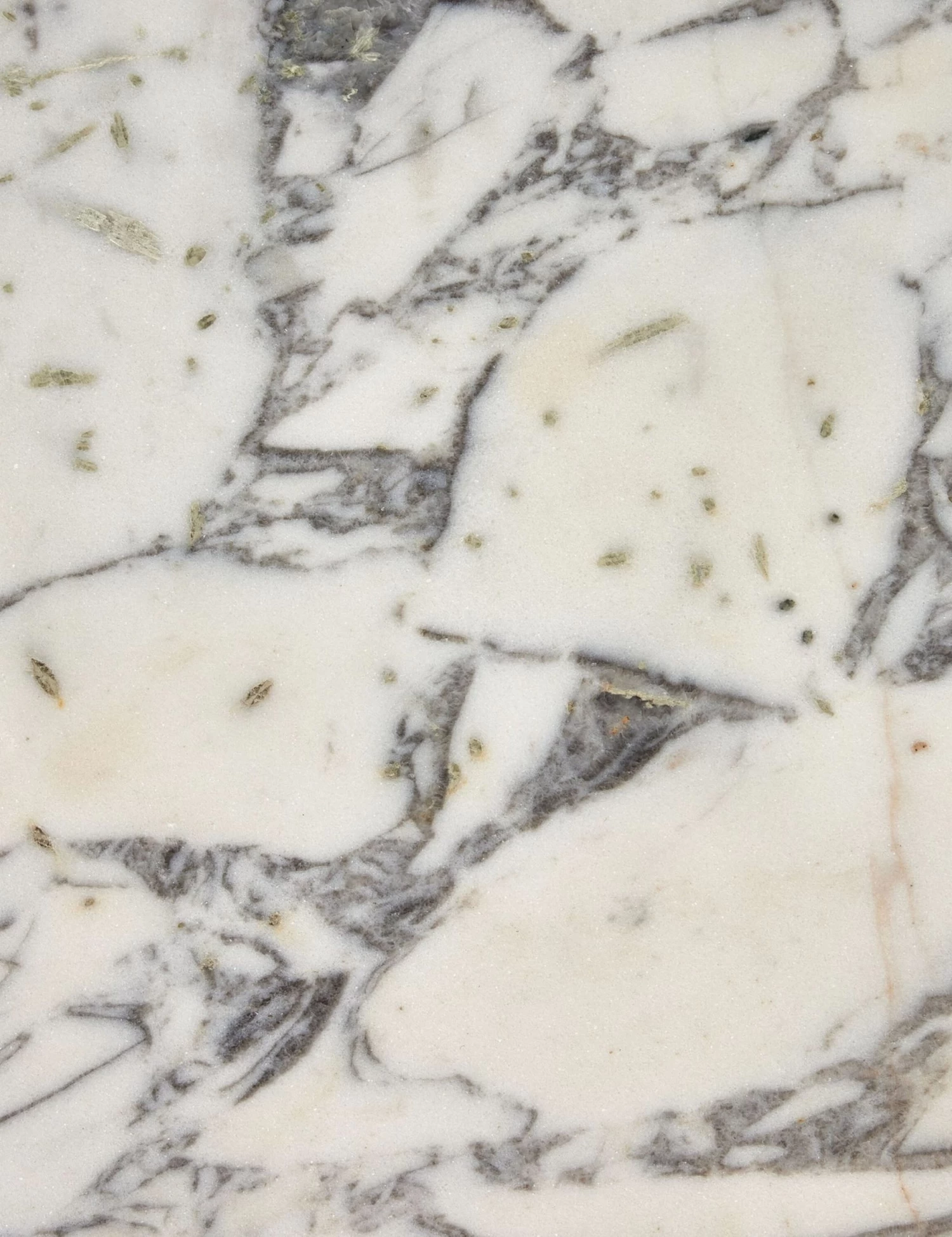 Curved lines create a sense of movement in the modern silhouette of this side table. Its round top is crafted of heavily veined white marble with a patina finish over its metal base, adding the perfect dose of contrast and rustic character to contrast the luxury of the end table’s marble top.
