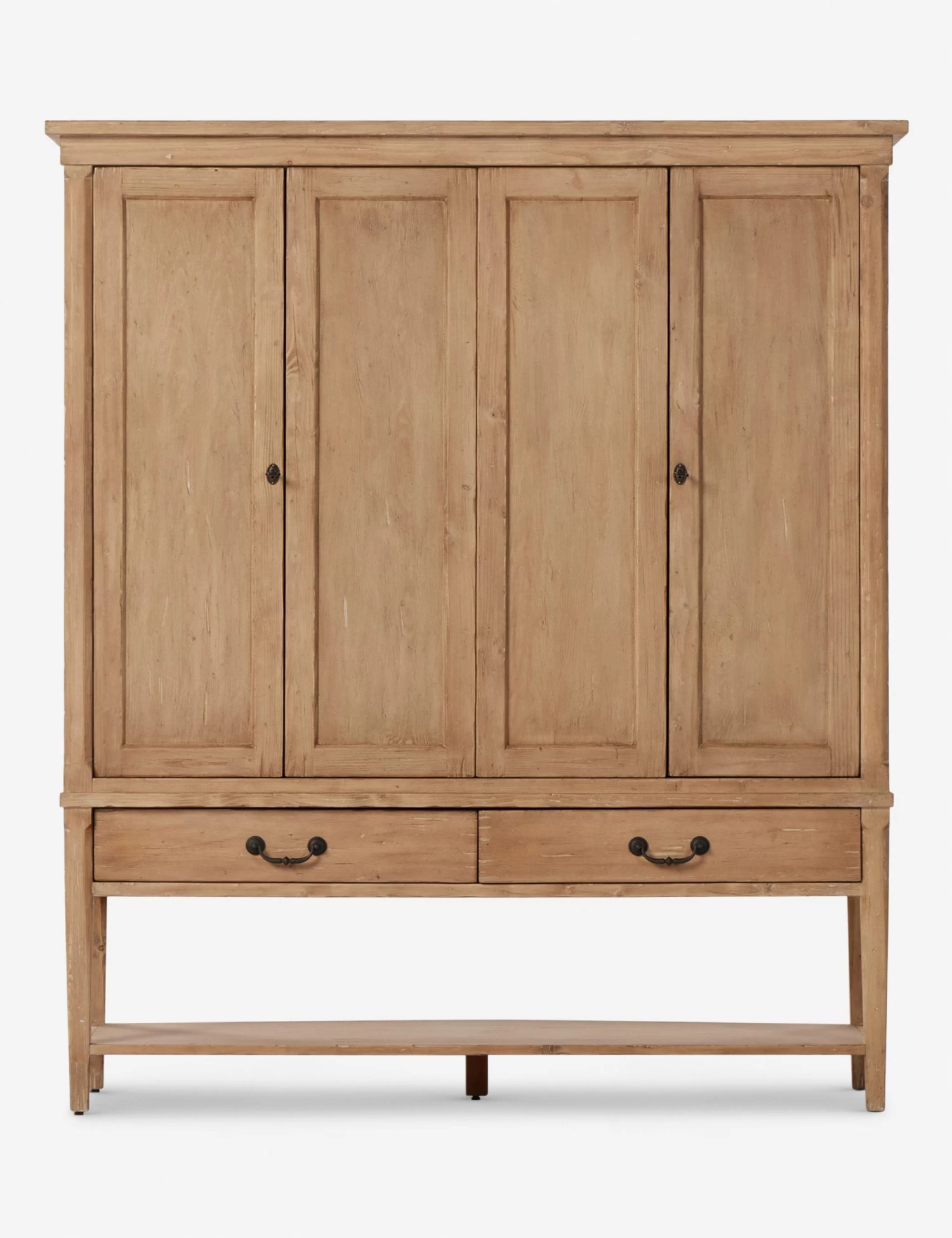 With its light wood finish and timeless detailing, this double cabinet brings the clean warmth of Scandinavian design to a beautiful storage piece. Two sets of push-latch doors open to spacious interior shelving with two drawers and an open shelf below. We love the transitional appeal and versatility of this cabinet for a dining room, hallway, guest room, or lounge.
