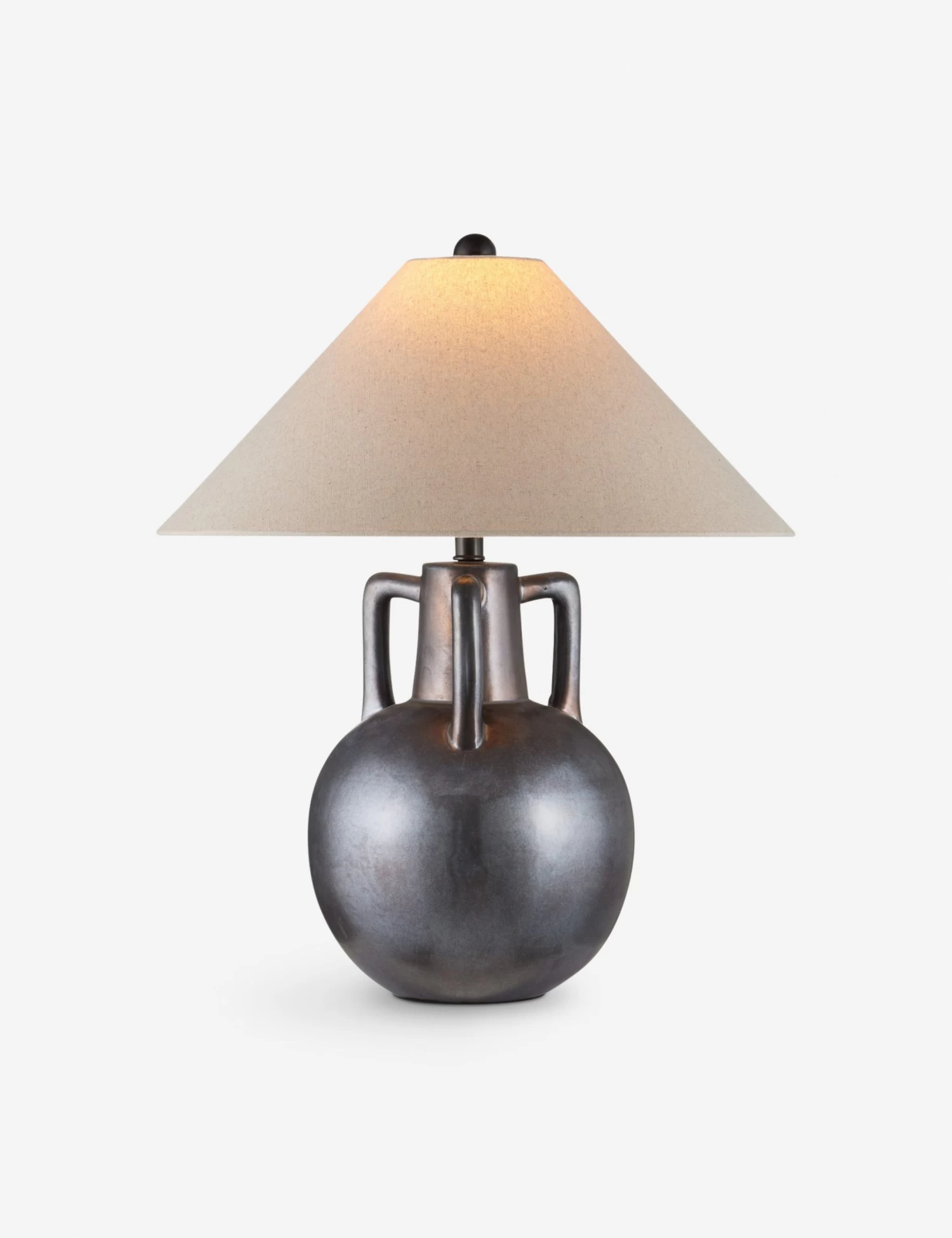 The Charbel table lamp styles an artisanal edge with its gleaming ceramic base and rich, reactive glaze. Three handles and a rounded silhouette evoke an amphora vase, paired with an oversized shade for soft, grounded balance. Let this ceramic lamp illuminate a cozy reading corner or sit on a nightstand.