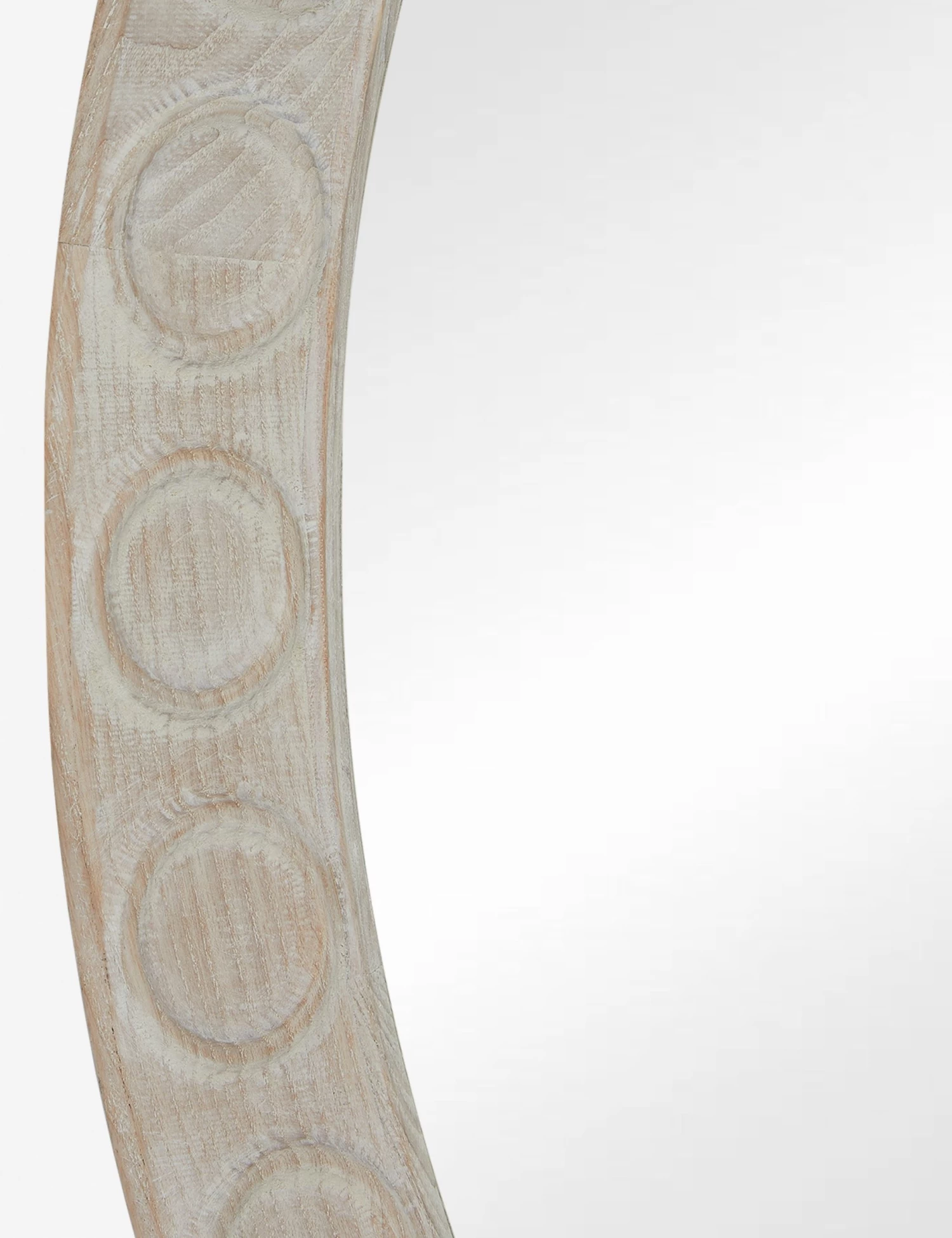 A weathered finish brings timeless texture to this framed mirror. The round mirror’s wood frame features raised rings and a decorative base piece that adds visual interest and dimensionality. It’s an elevating addition over a console in your entryway or brightening a hallway.