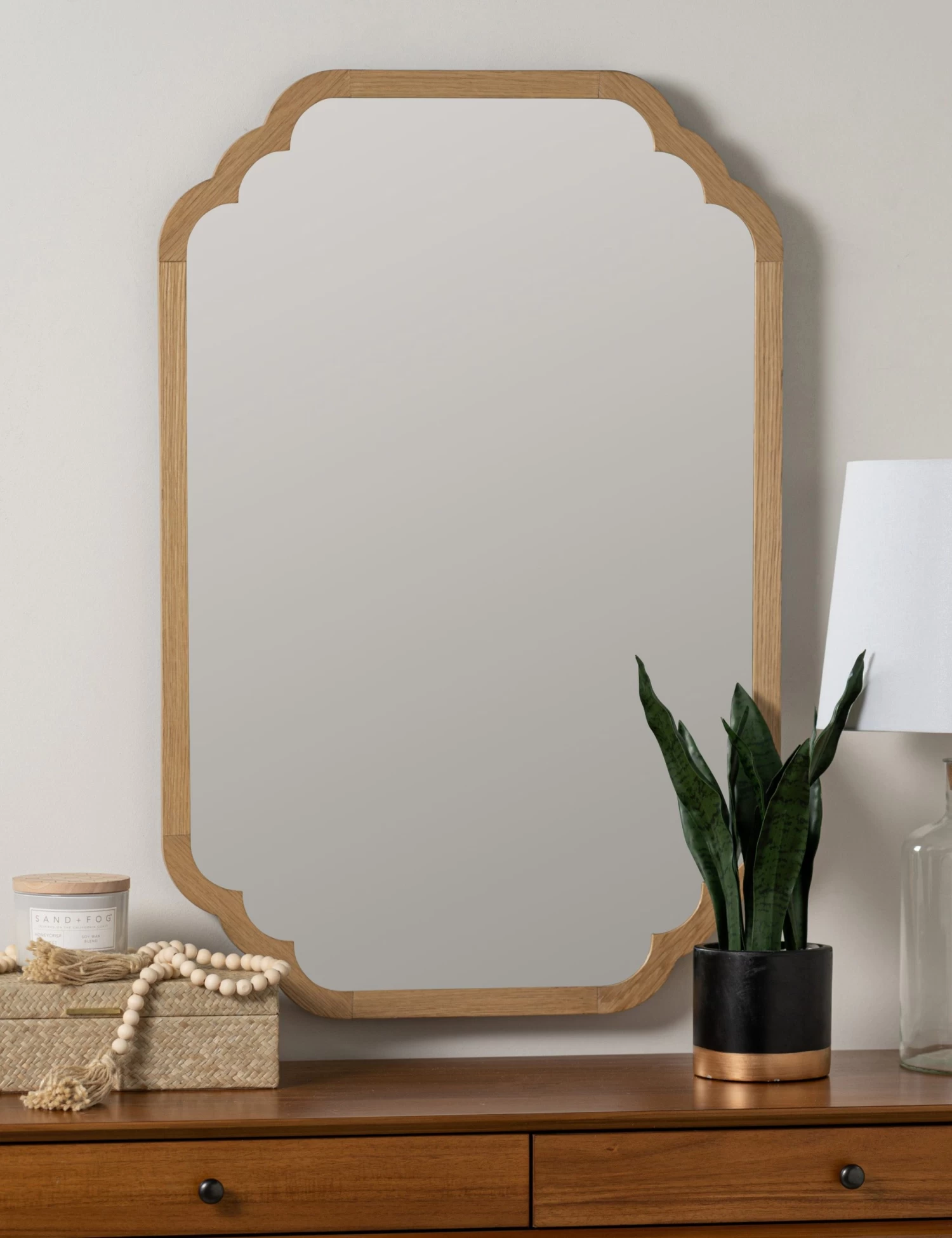 Effortlessly chic with a timeless charm—the Dandridge mirror is set for a transitional home design. The scalloped corners fashion a distinctive frame, offering warmth and splendor in a natural wood finish. Whether refining your lounge or augmenting light in a small-space design, this decorative mirror is the perfect touch.