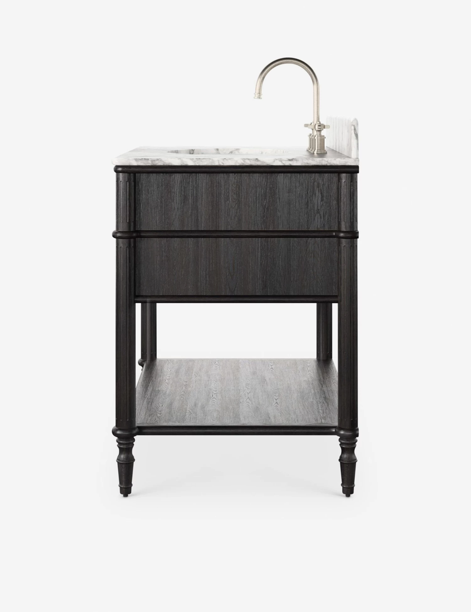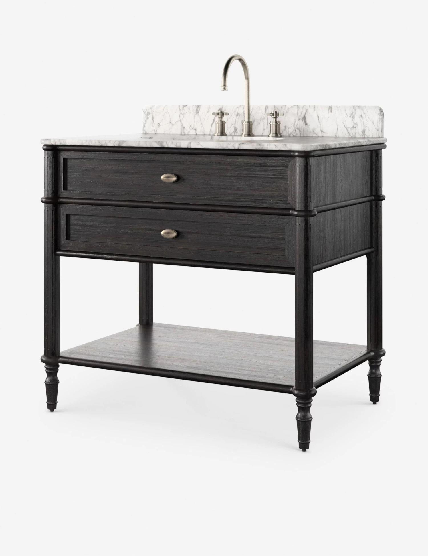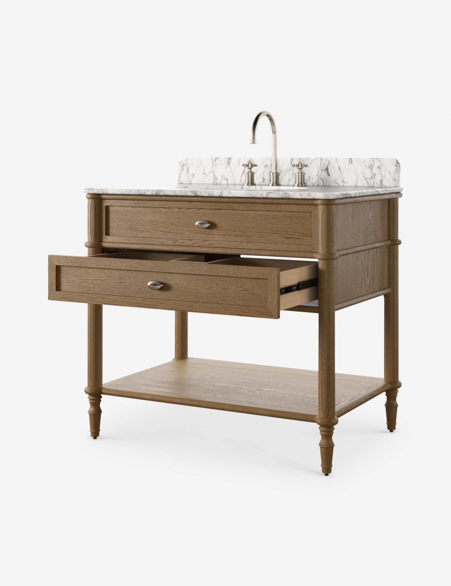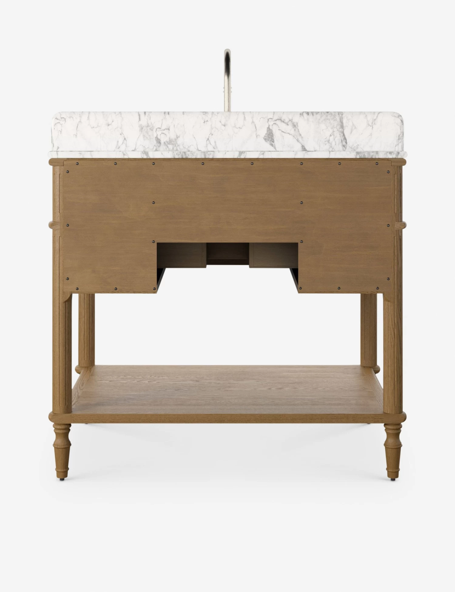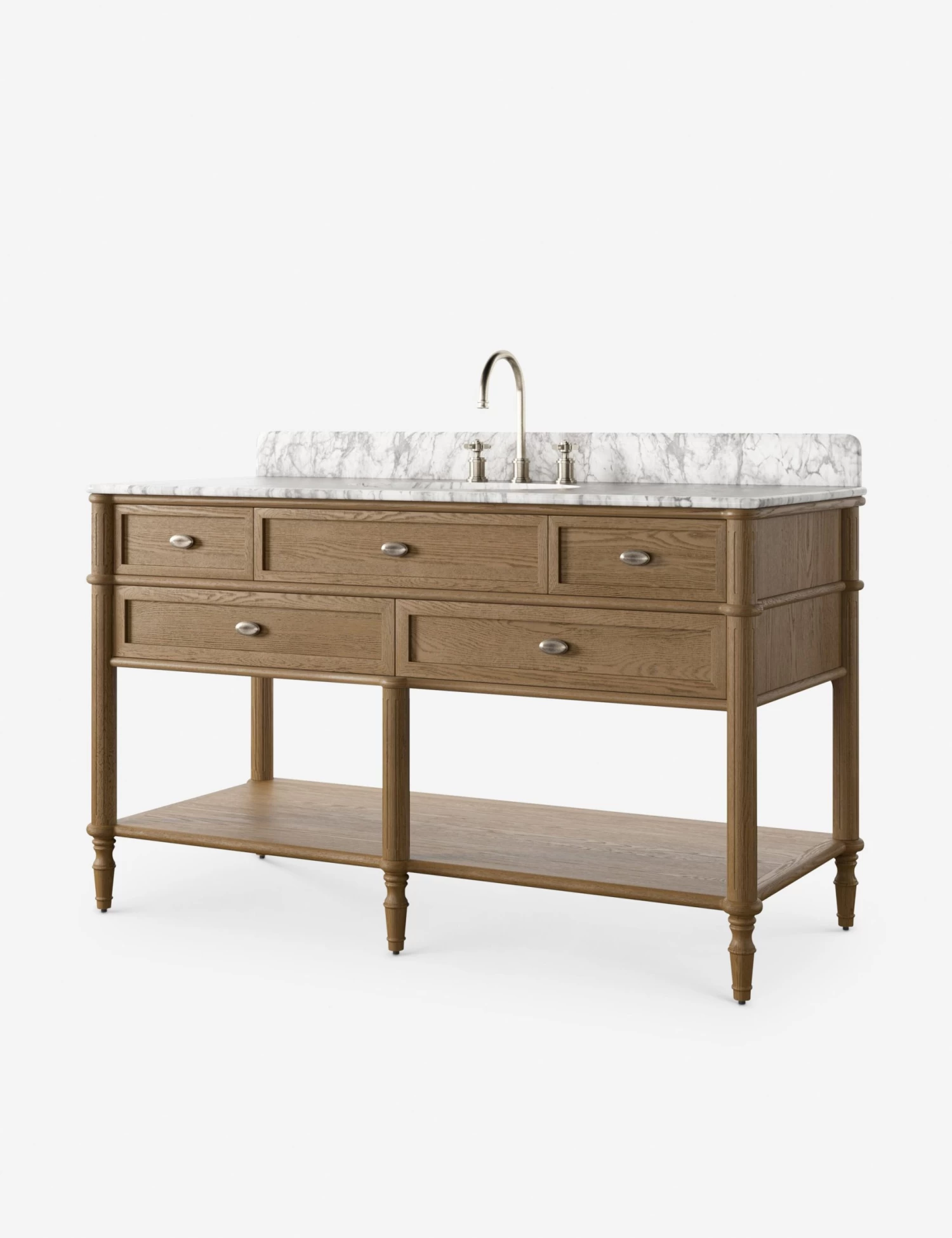 Traditional style meets modern appeal in this vintage European-inspired vanity. Turned legs and intricate detailing bring a timeless air to the oak-clad frame, with satin brass hardware and a Carrara marble top. The airy design offers ample storage, creating an elegant update to your powder room, guest bath, or en suite.