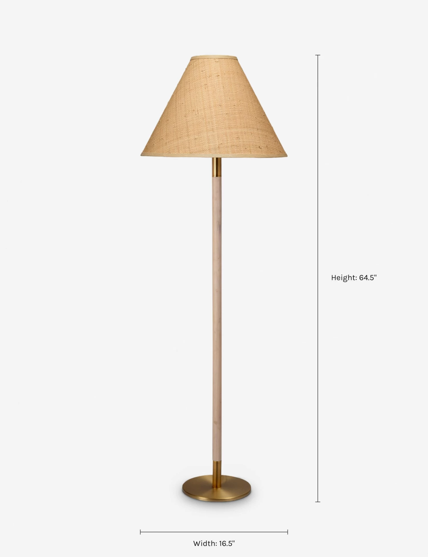 The Dey lamp offers a beautiful mix of materials in one thoroughly refined design. Its shade is handwoven with raffia, echoing the organic tone of the light wood stem. Brass-finished accents at its base and top complete the look with a touch of polish—styling a versatile floor lamp for transitional decor.