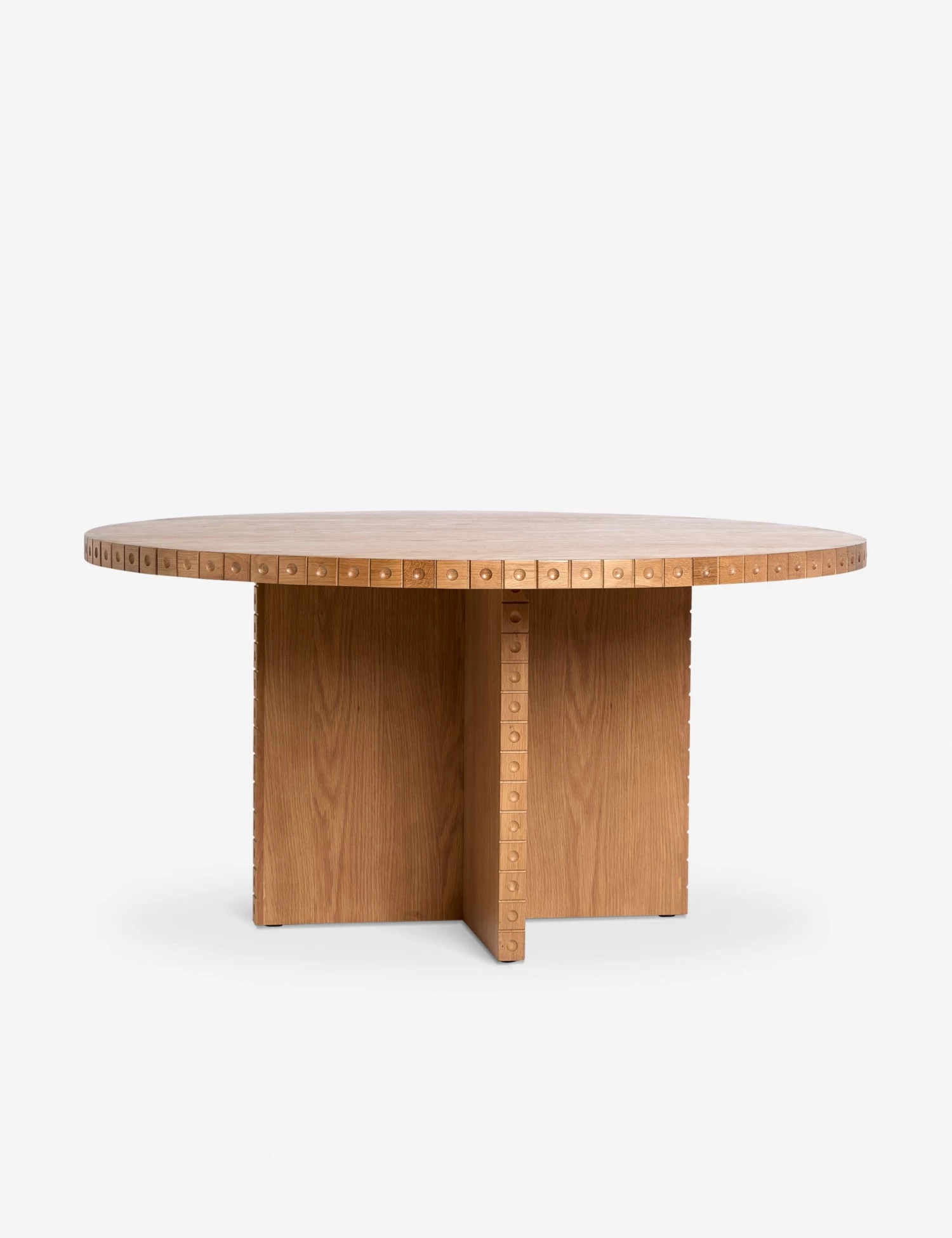 Natural grain impact meets artisan detail in our Edda dining table. The round table features a carved dot trim for a modern feel grounded in organic warmth. Small bun feet lift the piece off the ground for a light, elegant bearing in your room.