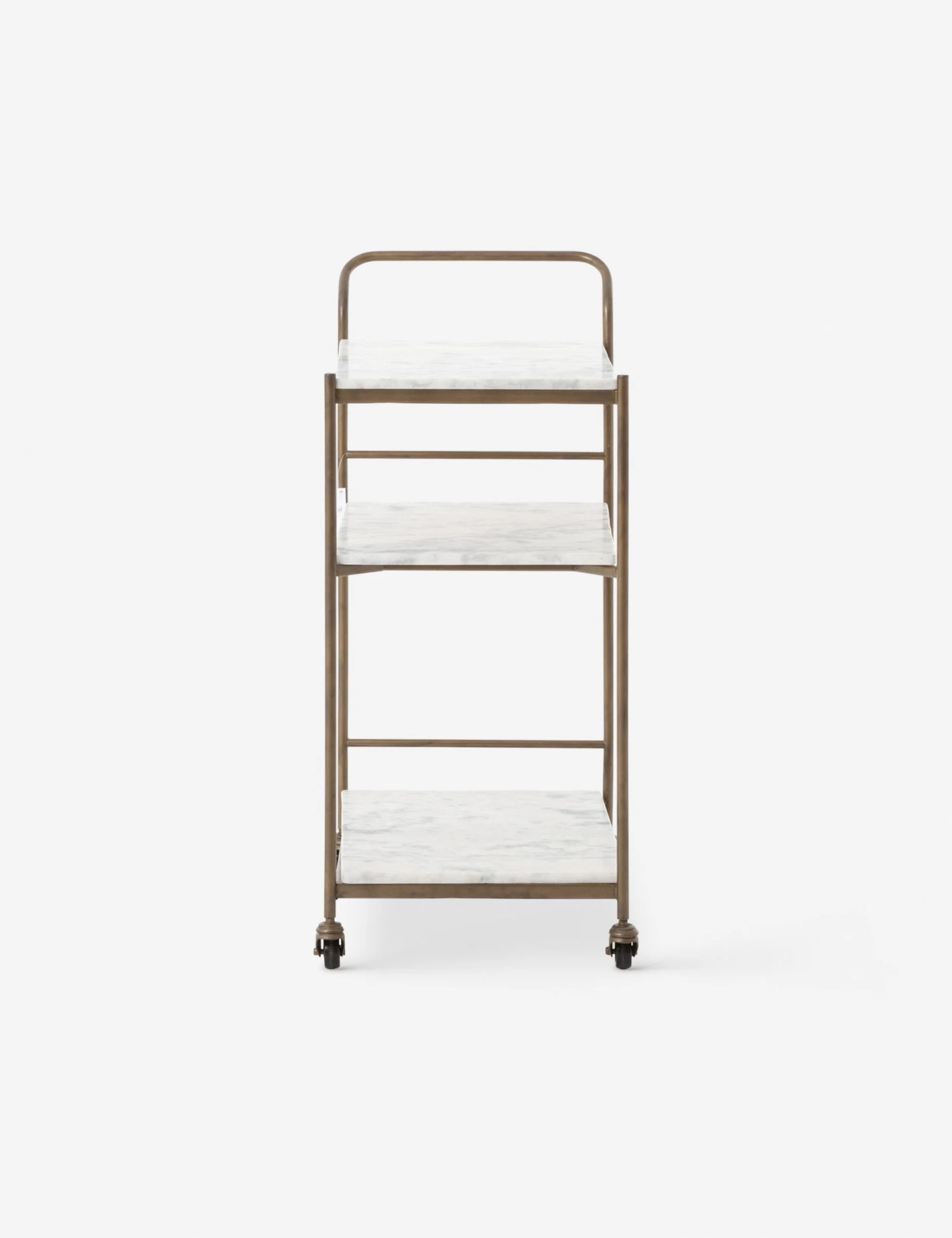 Add a dash of polish to your look with this chic bar cart. White marble shelving offers a luxe touch to the antique brass frame, while casters let you bring the cart to the party for dynamic entertaining in your living space, dining room, or kitchen.