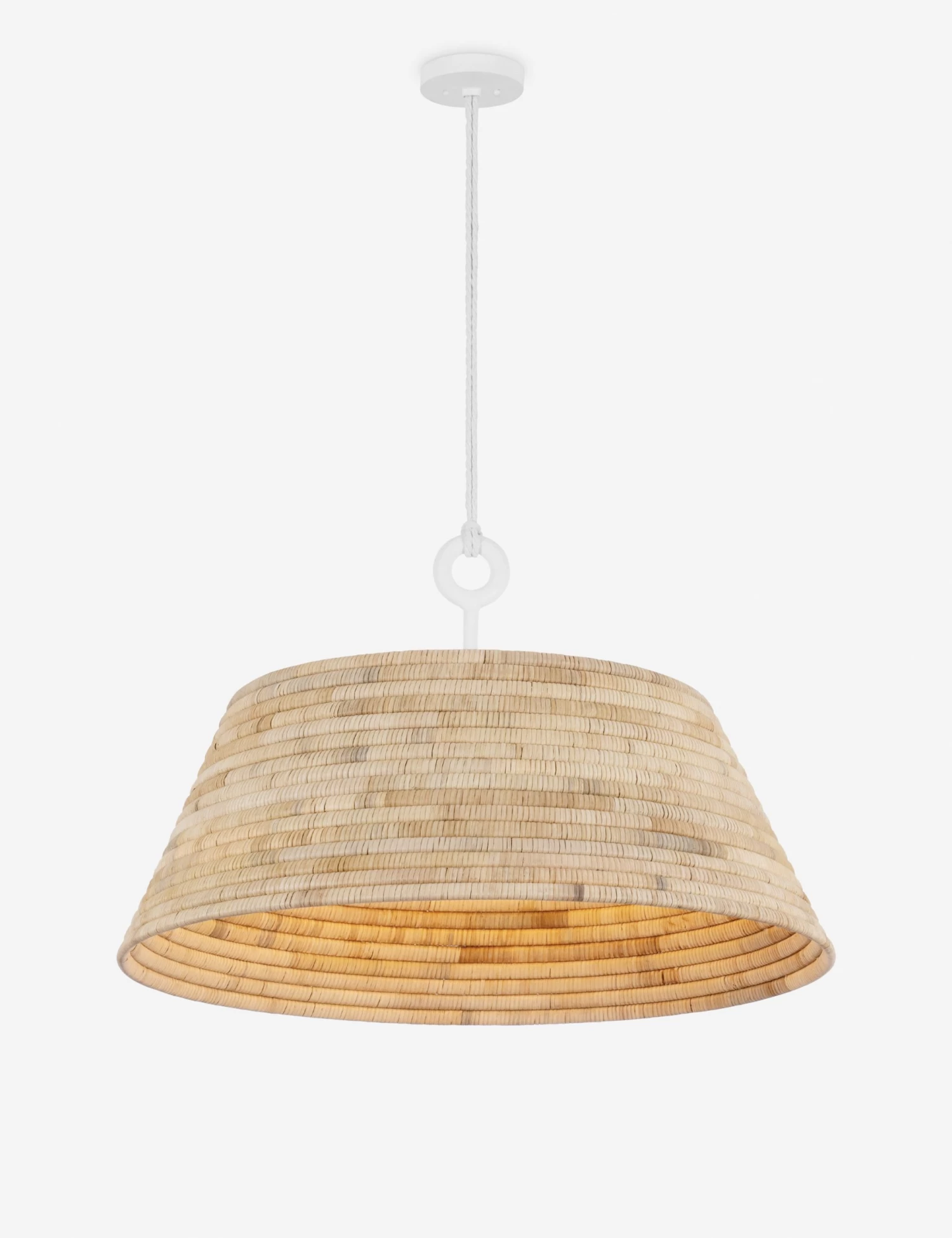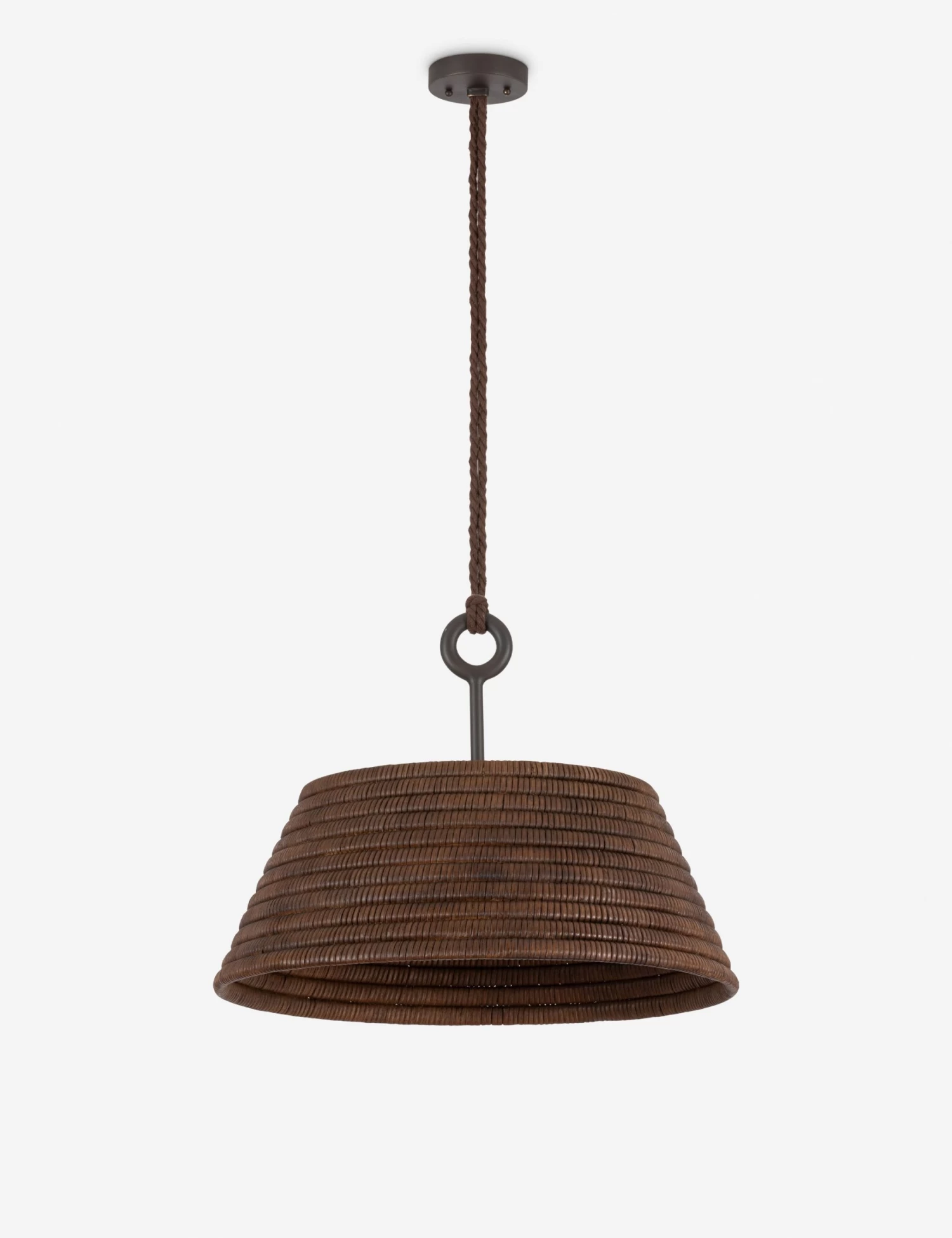 The Farida pendant balances woven texture with a strong form. A rounded woven shade meets forged hardware for a look that nods to nautical shapes. Use this pendant light to ground an entryway or bring warmth to a high-ceilinged room.
