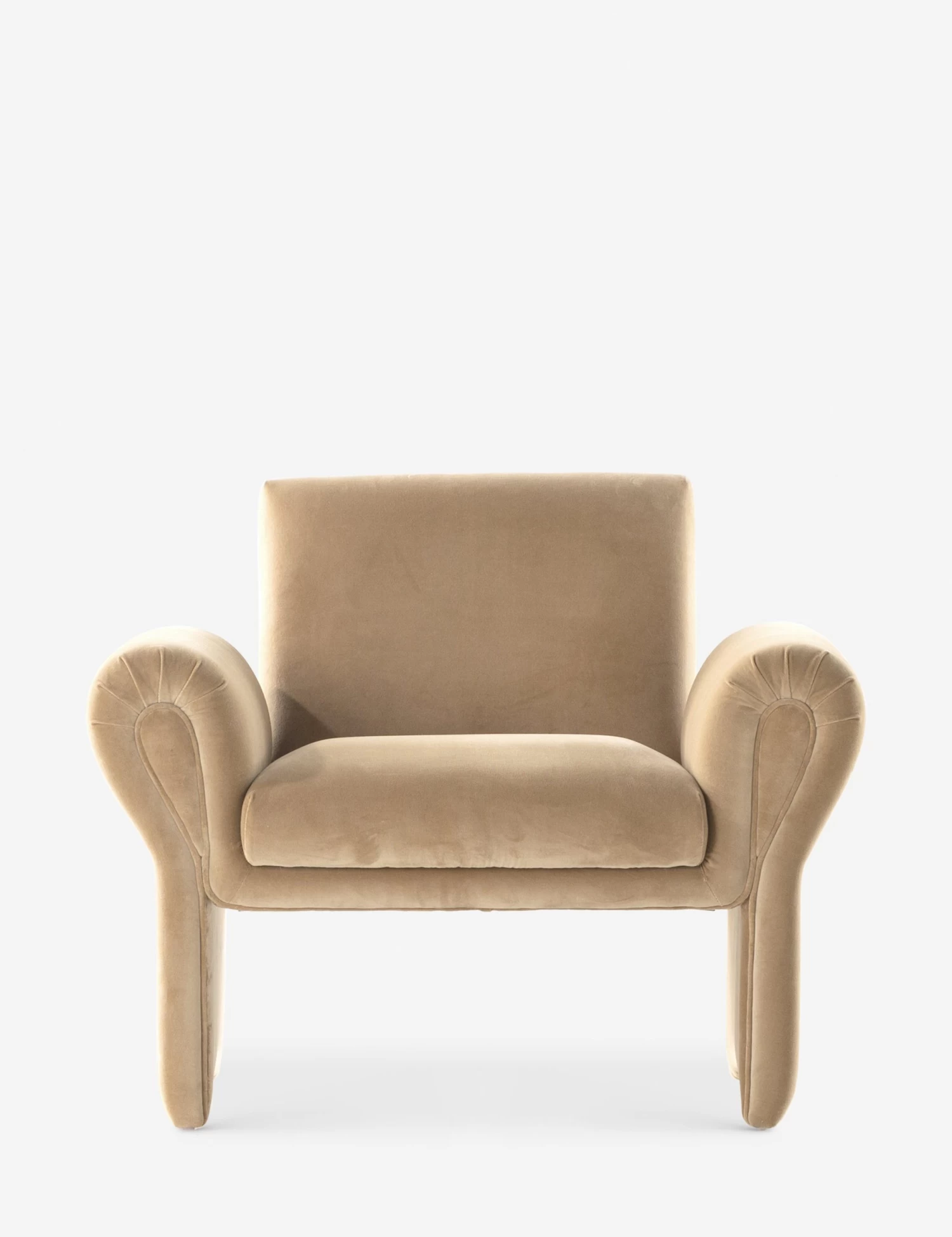 Style meets comfort in this chic lounge chair. The airy silhouette is upholstered in a beautifully toned camel velvet, adding a smooth elegance to its dramatic lines. We love the eye-catching design as an accent chair for a transitional bedroom or lounge.