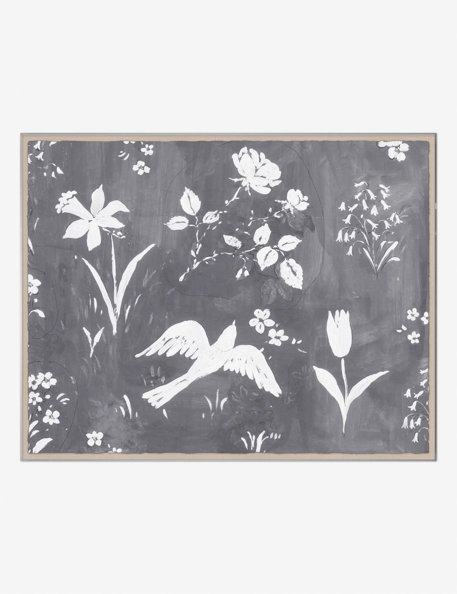 Elevate your wall decor with the iconic work of textile artist, engraver, and painter Paule Marrot. Each print captures her simple, lyrical style with boldness and fidelity—offering wall art with a fresh yet enduring appeal. With white silhouettes of flowers and birds, this minimalist composition exudes quiet elegance.