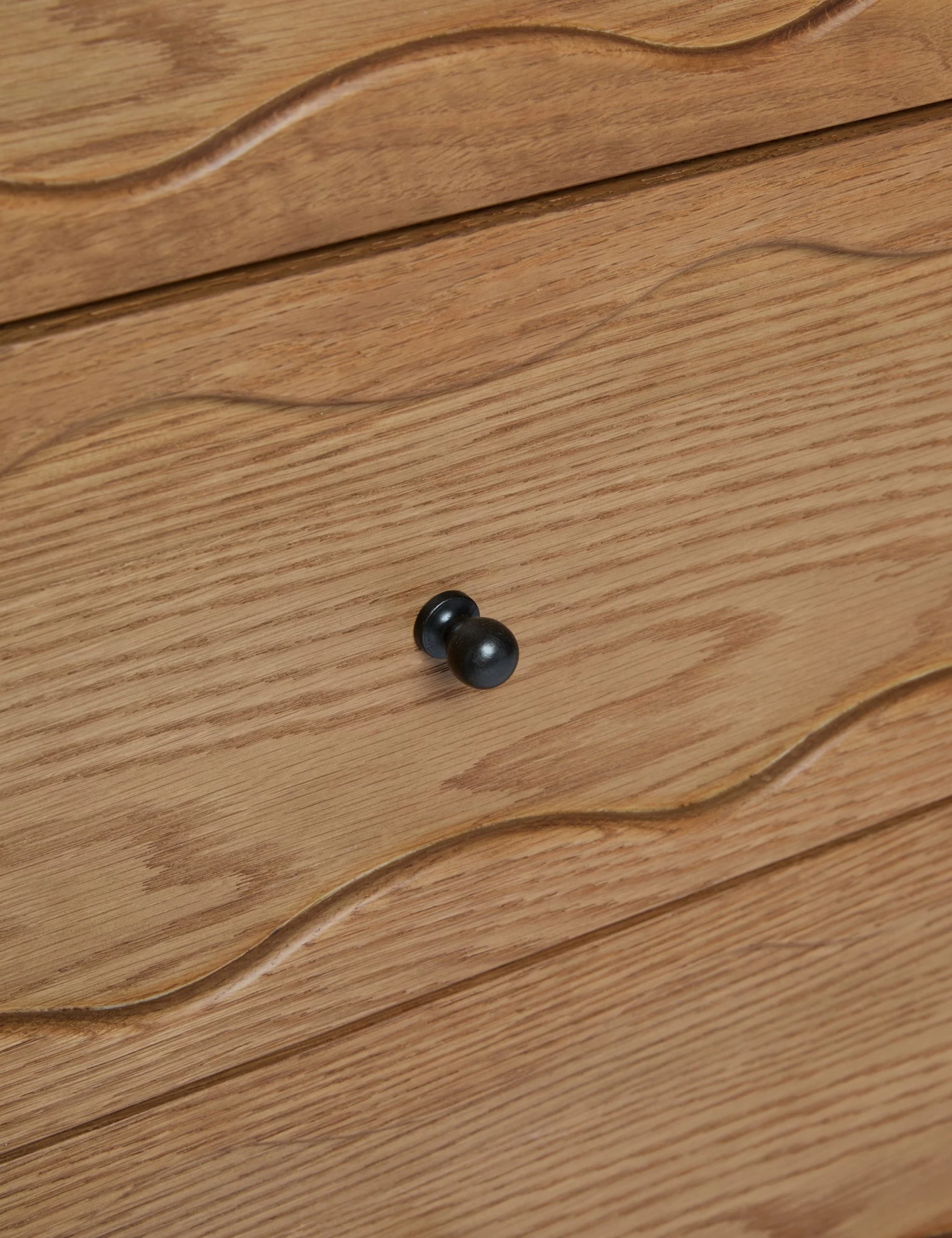 In this exclusive collection, Aimee Song brings her beloved fashion sense home with artful elements designed for living. The Fontaine sideboard offers modern storage with a timeless touch. This sideboard cabinet feature three drawers flanked by two large doors with wavy detailing, black knob pulls, and ball feet to complete the look.