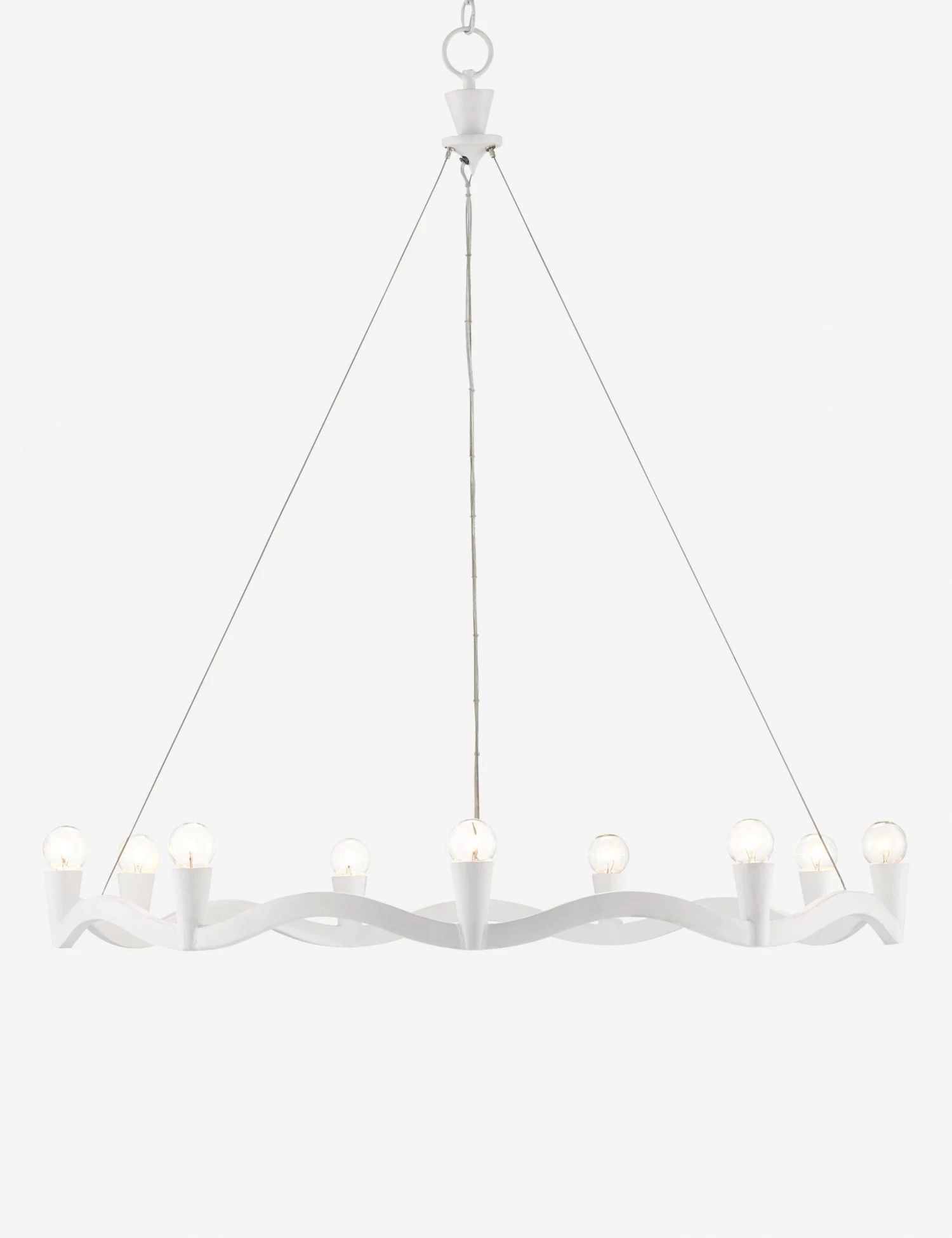 Fox brings a chic edge to the classic ring chandelier. Wrought iron is transformed in the undulating frame and suspended from cables for an airy, lightness in the design. This large chandelier offers statement appeal for spaces where traditional and modern elements come together in a tailored blend.