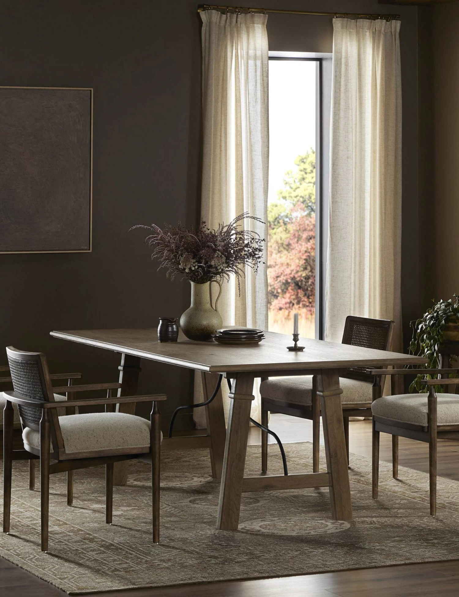 Four Hands brings their exceptional craftsmanship to a timeless collection rooted in Amber Lewis’ perennial California style. Classic Spanish styling marks this drifted oak dining table with a curved, hammered iron stretcher. Pared back lines bring a light, modern feel to the table’s traditional silhouette.