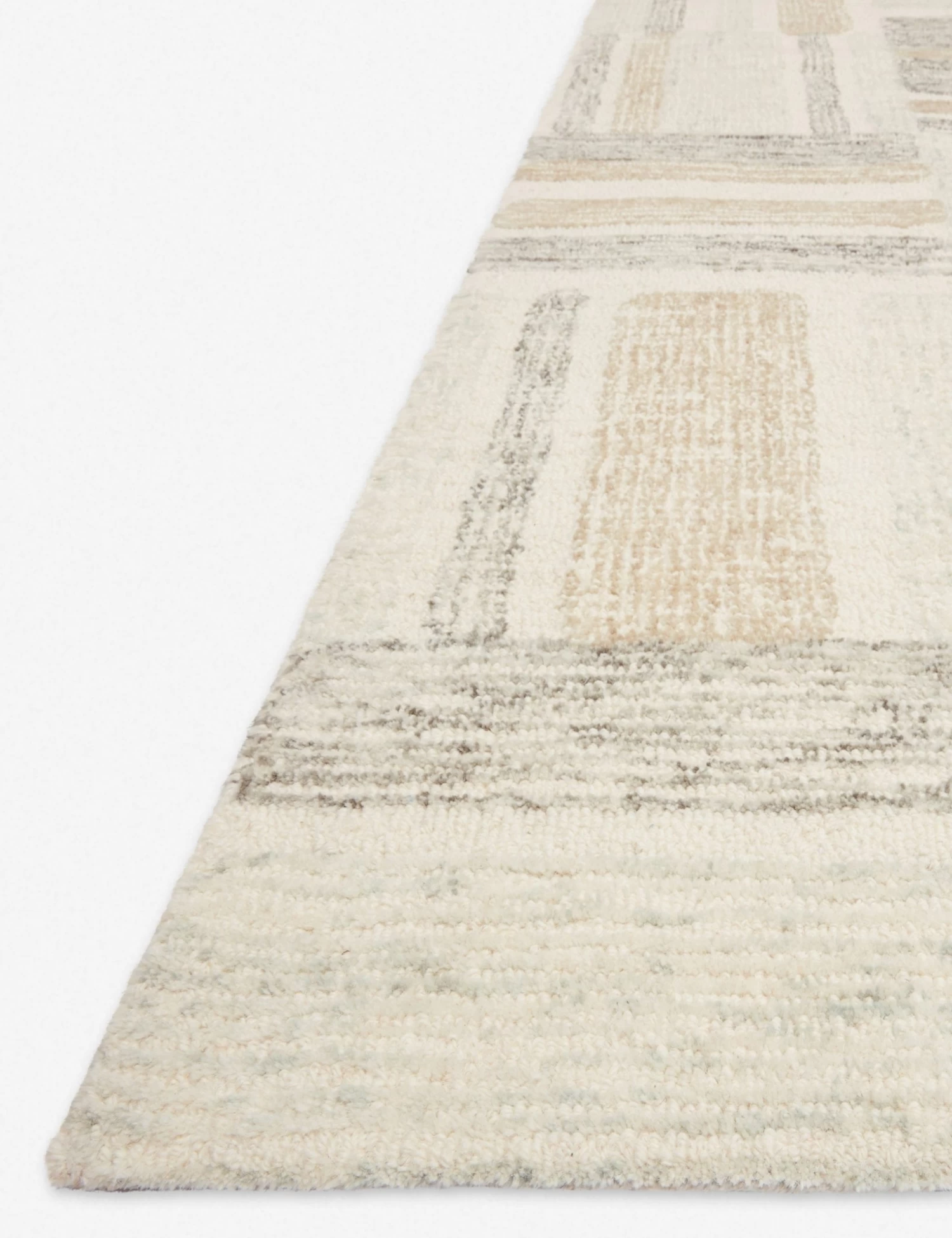 Hand-tufted by Indian artisans, this wool floor rug features an abstract geometric pattern that is softened a bit by its muted color palette. Dreamlike and playful, this beautiful area rug works well in your children’s room or nursery, or as a focal point in a bedroom or living room with tons of textural, cozy accents.