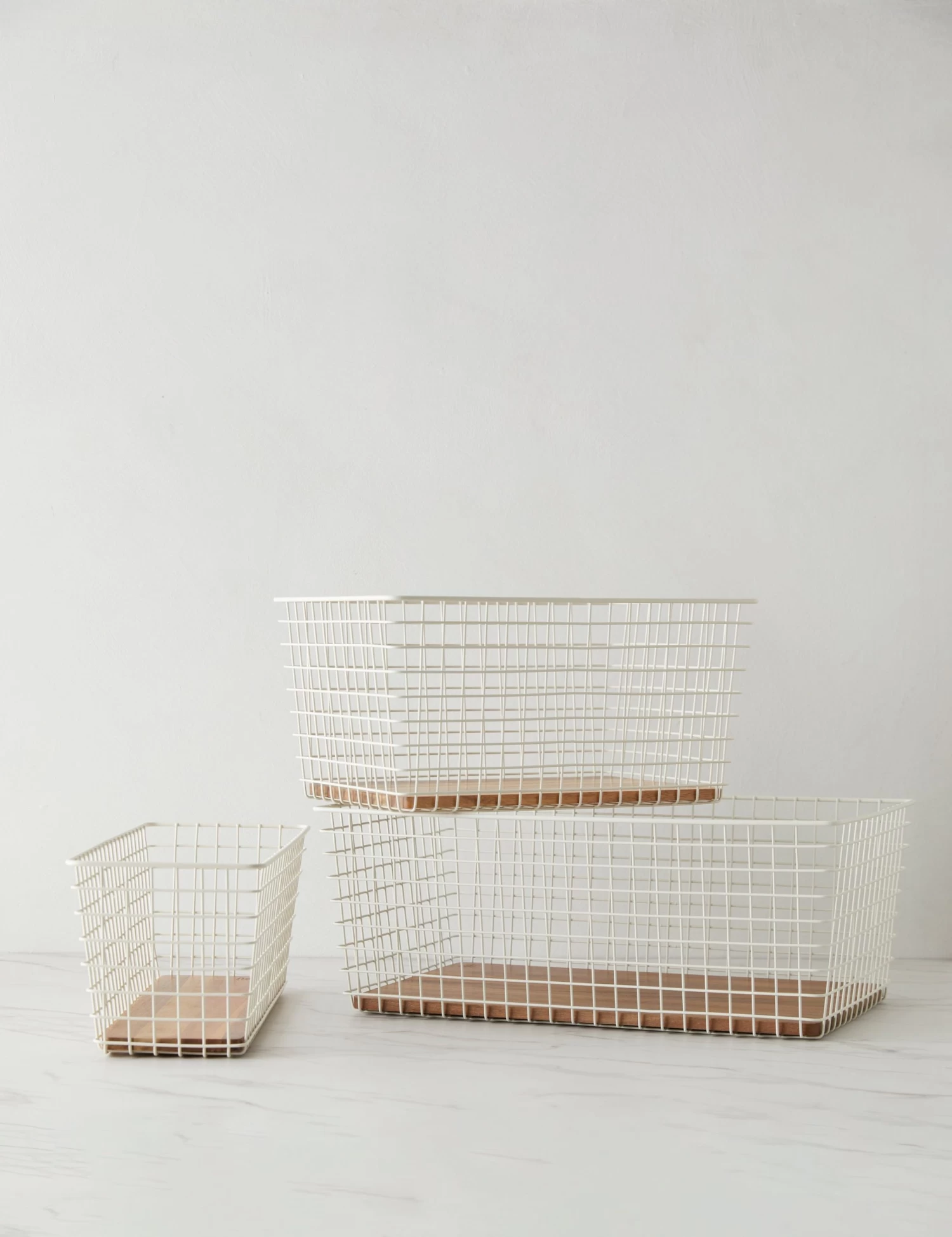 Keep your look sorted with this versatile, lightweight storage solution. This chic wire basket comes with a removable acacia wood base to keep your items upright and in place while layering your look with a mixed material appeal.