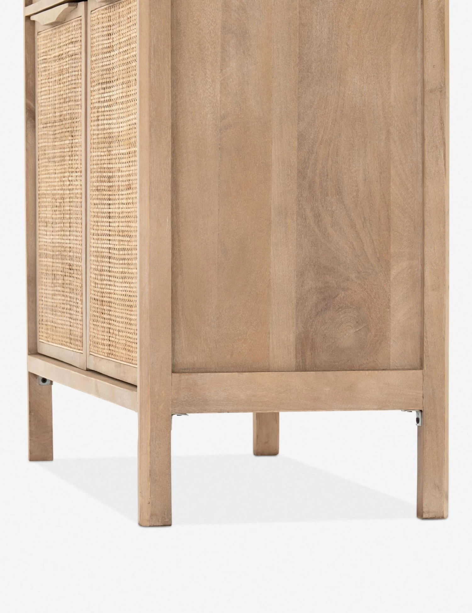 Clean lines and an airy profile bring a cool coastal feel to the Hannah dresser. We love the classic touch of the woven cane front for its natural texture and warmth. This tall dresser features three drawers with cabinet doors below—versatile storage for a bedroom or home office.