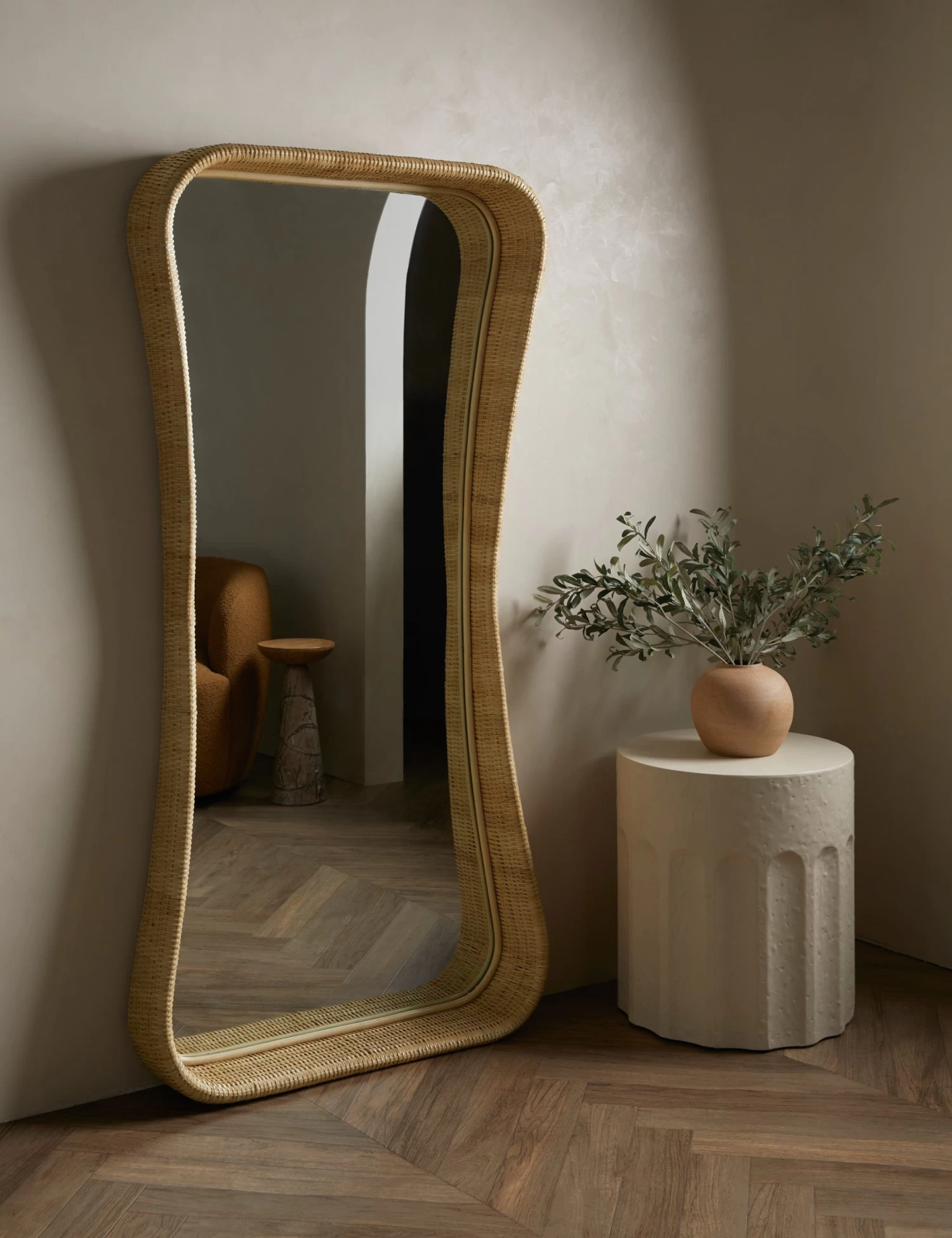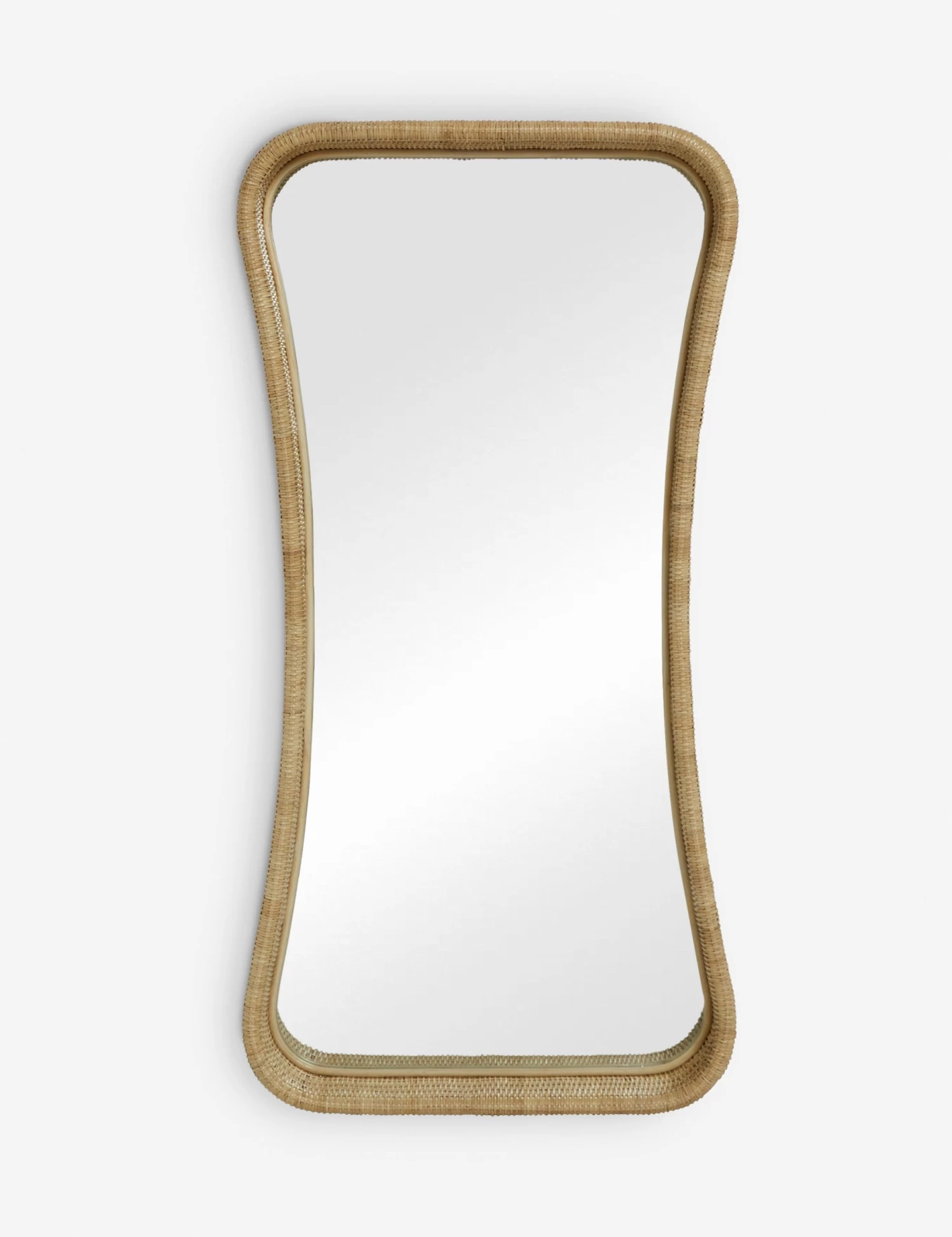 Wicker meets modern in this stylish floor mirror. The flowing lines and light finish offer a soft presence in the room set for versatile style appeal. This floor mirror is set to transform your space with its bright and elevating charm.