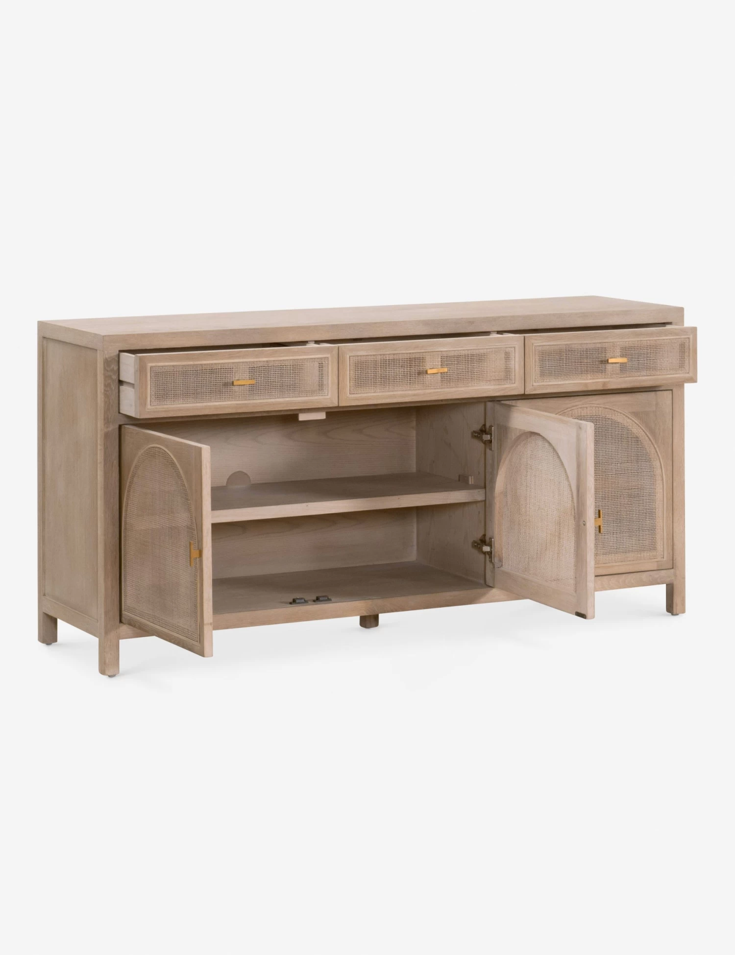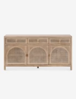 Timeless lines for a modern design. The Imiza sideboard’s light wood finish and arched cane doors inspire a coastal feel with its airy, rustic character. With adjustable shelves and three drawers, this sideboard cabinet makes a versatile storage piece for a dining room, bedroom, or living space.