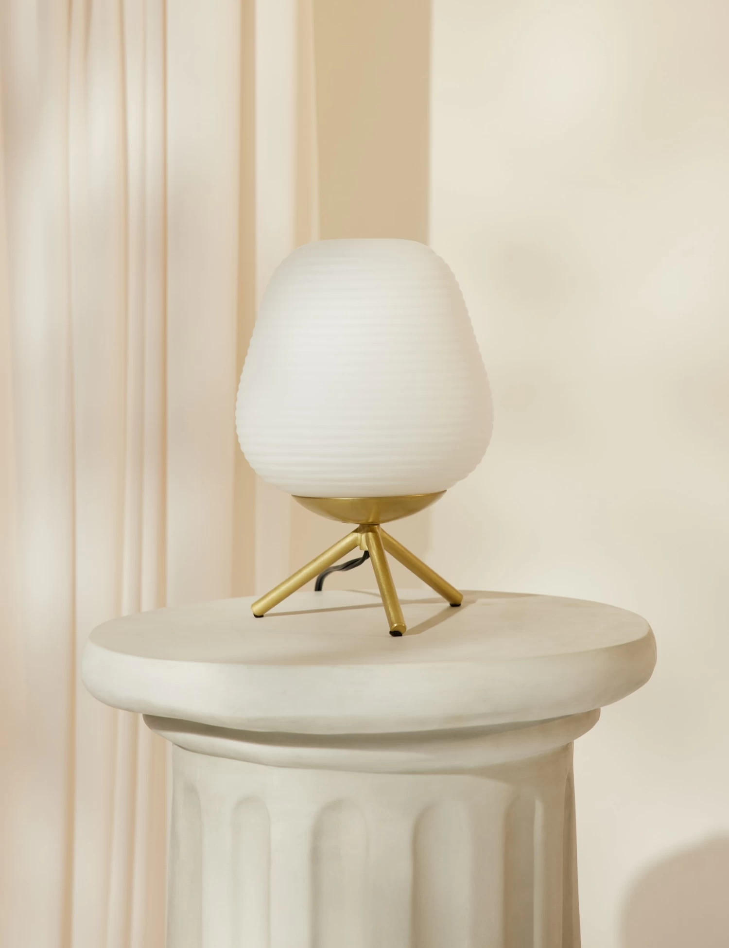 With its rounded and rippled white shade design and gold accents, this table lamp showcases its distinctive Art Deco influence. Crafted from glass and metal, the opal matte finish softly diffuses the light to make this lamp a perfect fit on your bedroom nightstand or dresser.