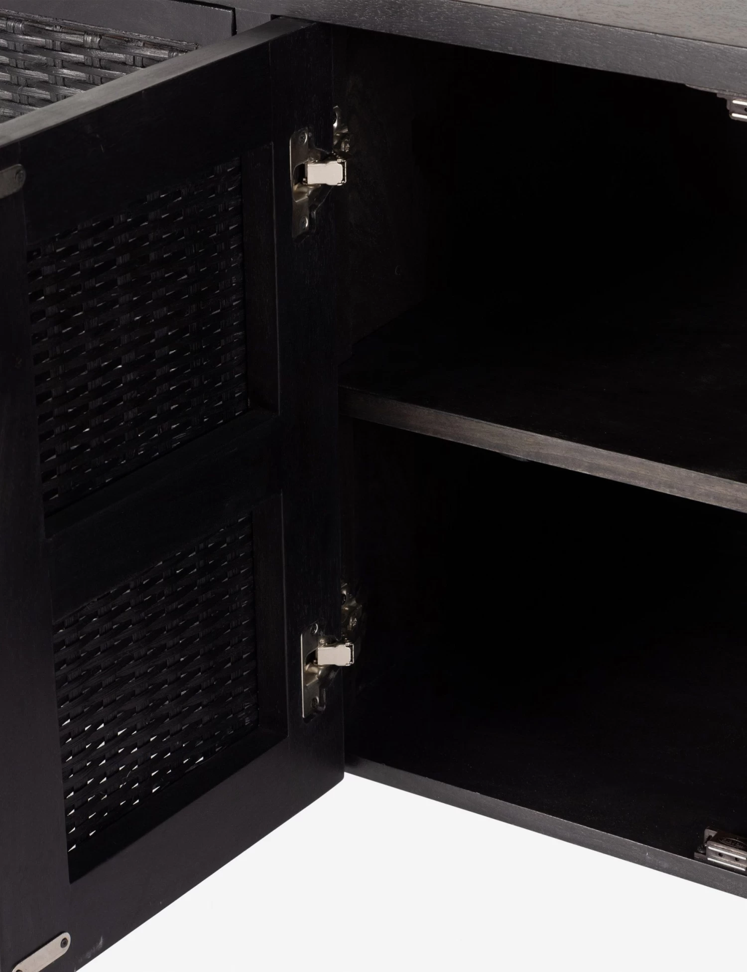 The Isaura media console offers textural impact in black. Its cane-paneled cabinets and drawers provide versatile storage solutions with cutouts behind for cord management. The dowel legs stand apart from the case, framing this console with an artful bearing.