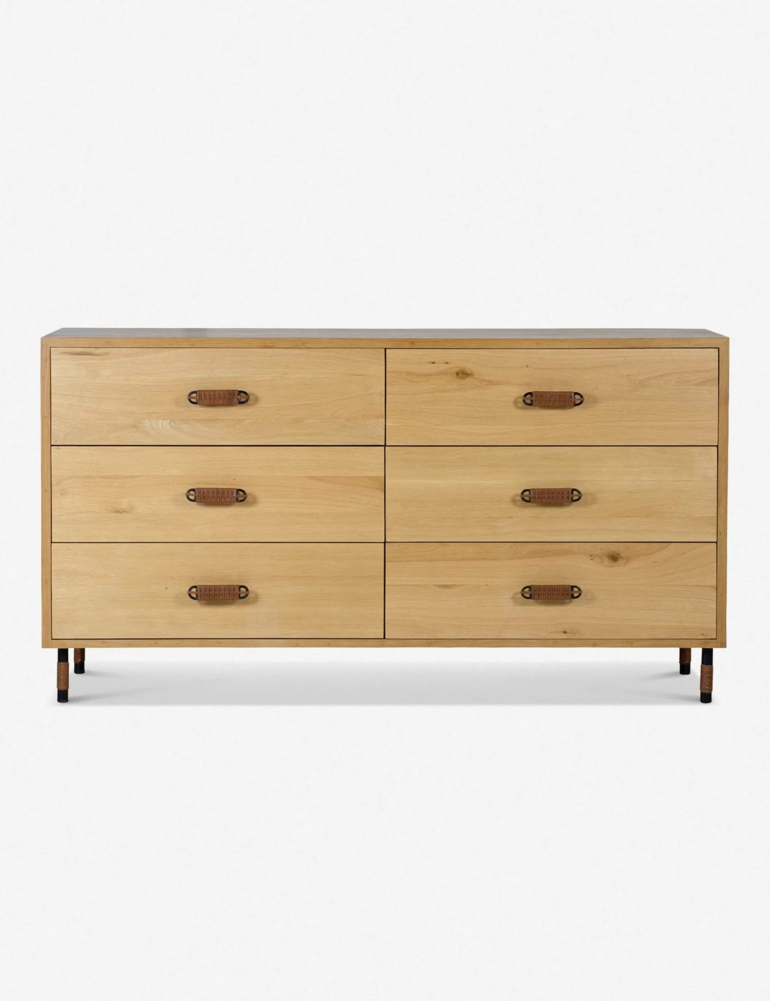 The Jaramillo collection features solid, squared oak construction, fitted with leather-wrapped, wrought iron pulls and legs for a timeless mixed material build. Six soft-close drawers offer ample storage in this versatile dresser design.