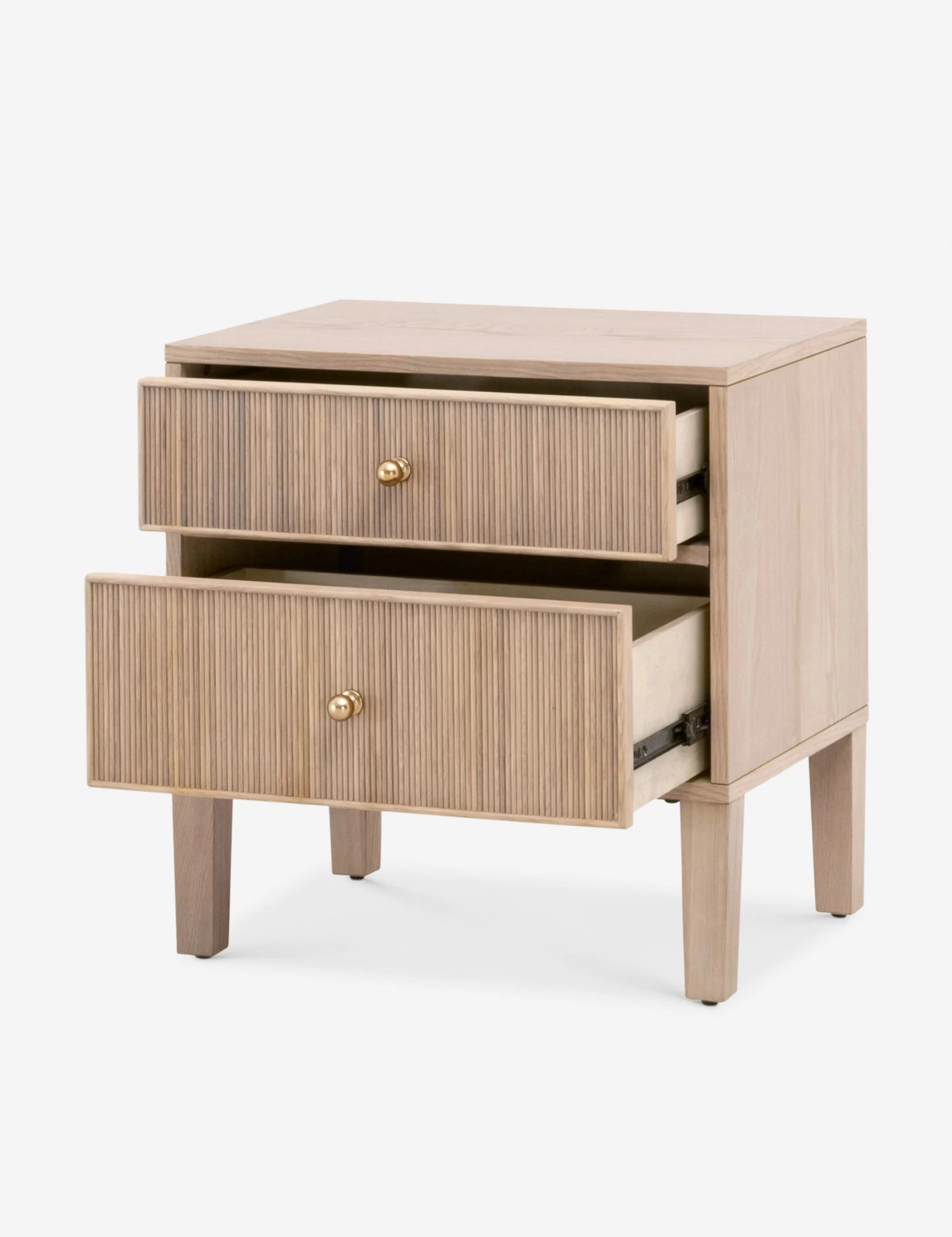 Stylish storage at your bedside. The Jesenia nightstand brings a chic touch to natural grain texture, featuring fluted drawers with brass-finished pulls set in a light oak case. We love the luxe detail of the felt-lined top drawer.