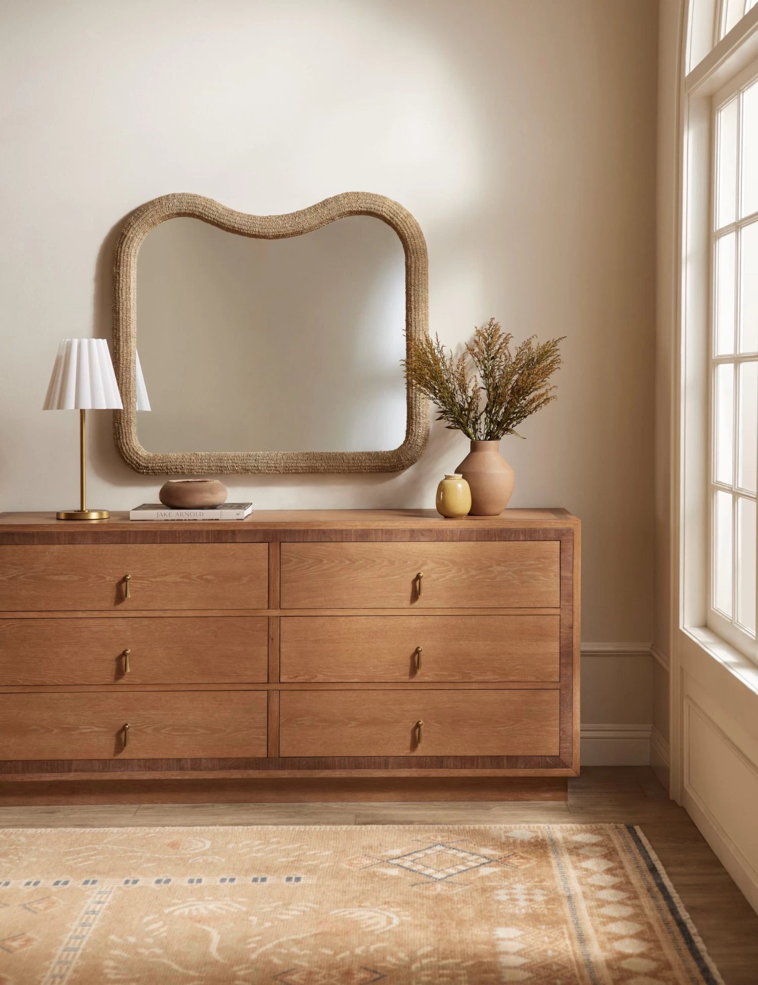 Bring a fresh textured look to your walls with our Kacia mirror. The woven frame offers a rich natural touch with a camel hump shape for a modern edge. This mantel mirror is perfect for creating bright depth over a fireplace or entryway table.