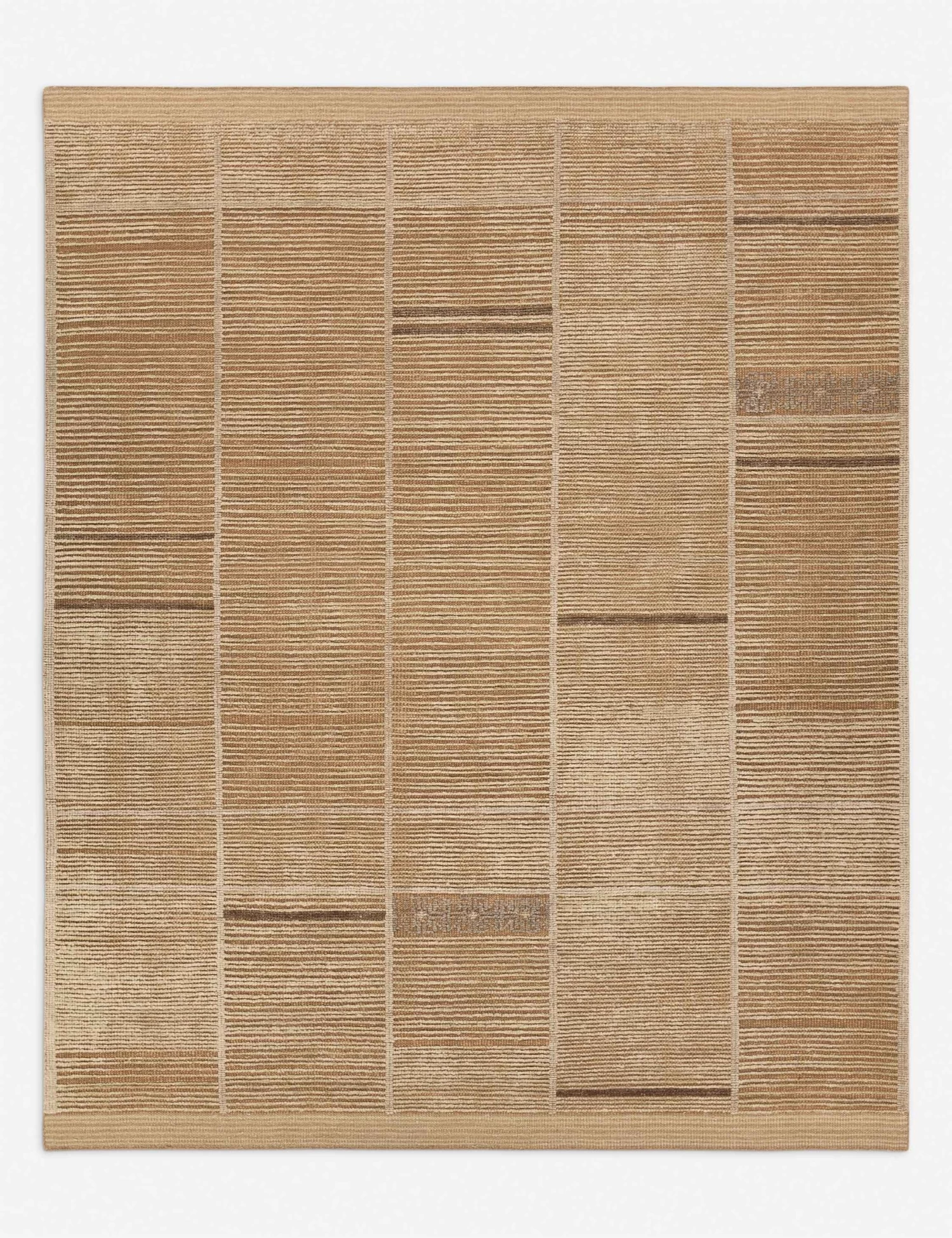The Kindholm rug layers tonal contrast with a mid-century–inspired linear design. Hand-knotted from wool, its high-low pile brings subtle depth and texture underfoot. This wool rug provides a grounded foundation for bedrooms, living rooms, or dining areas.