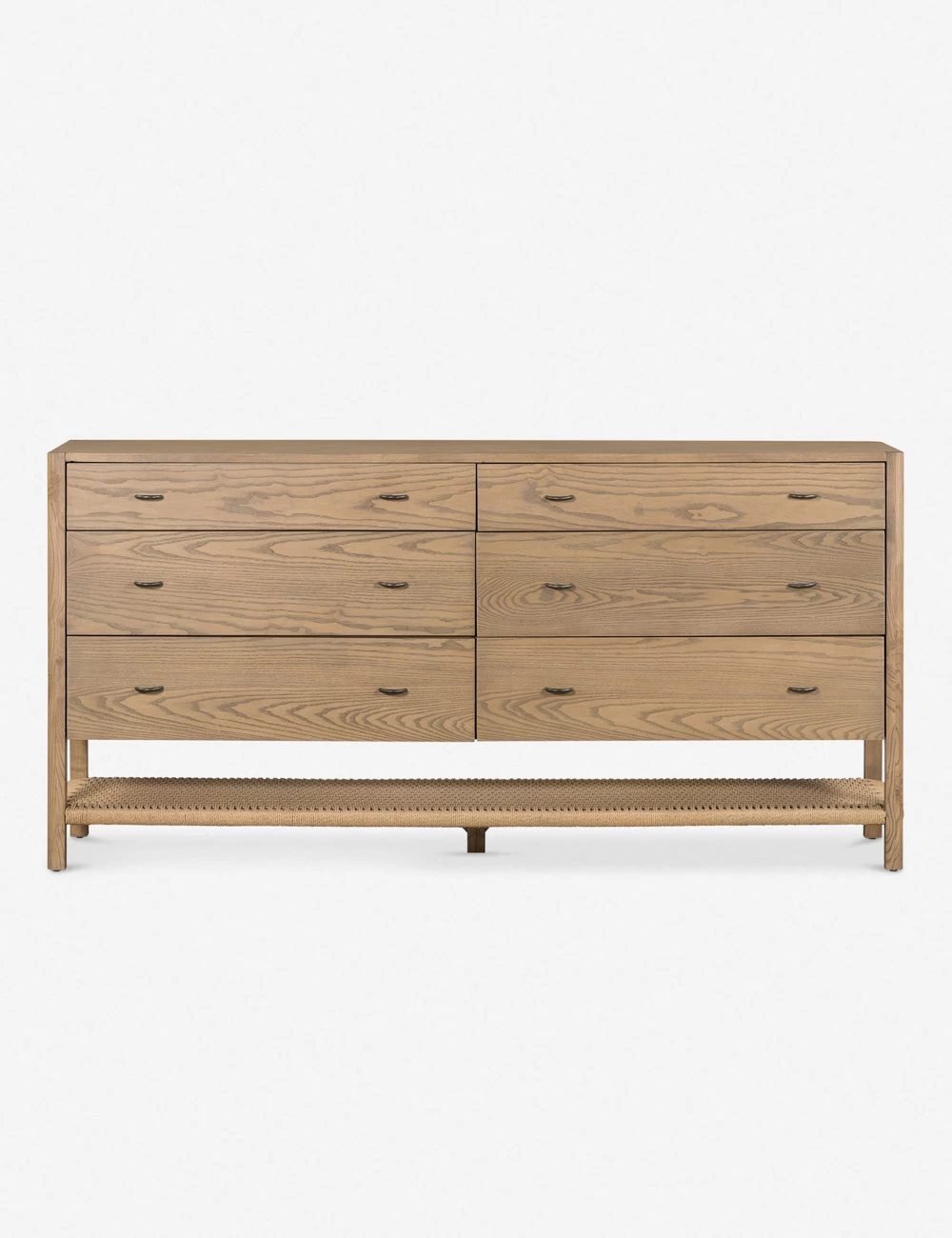 A clean-cut, ash wood design brings Danish-inspired warmth to this Laird dresser. Iron arch pulls complete the look, while the woven cord shelf offers the perfect textural touch. With six spacious drawers, this long dresser will fashion your bedroom with ample storage and natural grain appeal—plus, the lower open shelf is great for baskets or bins.