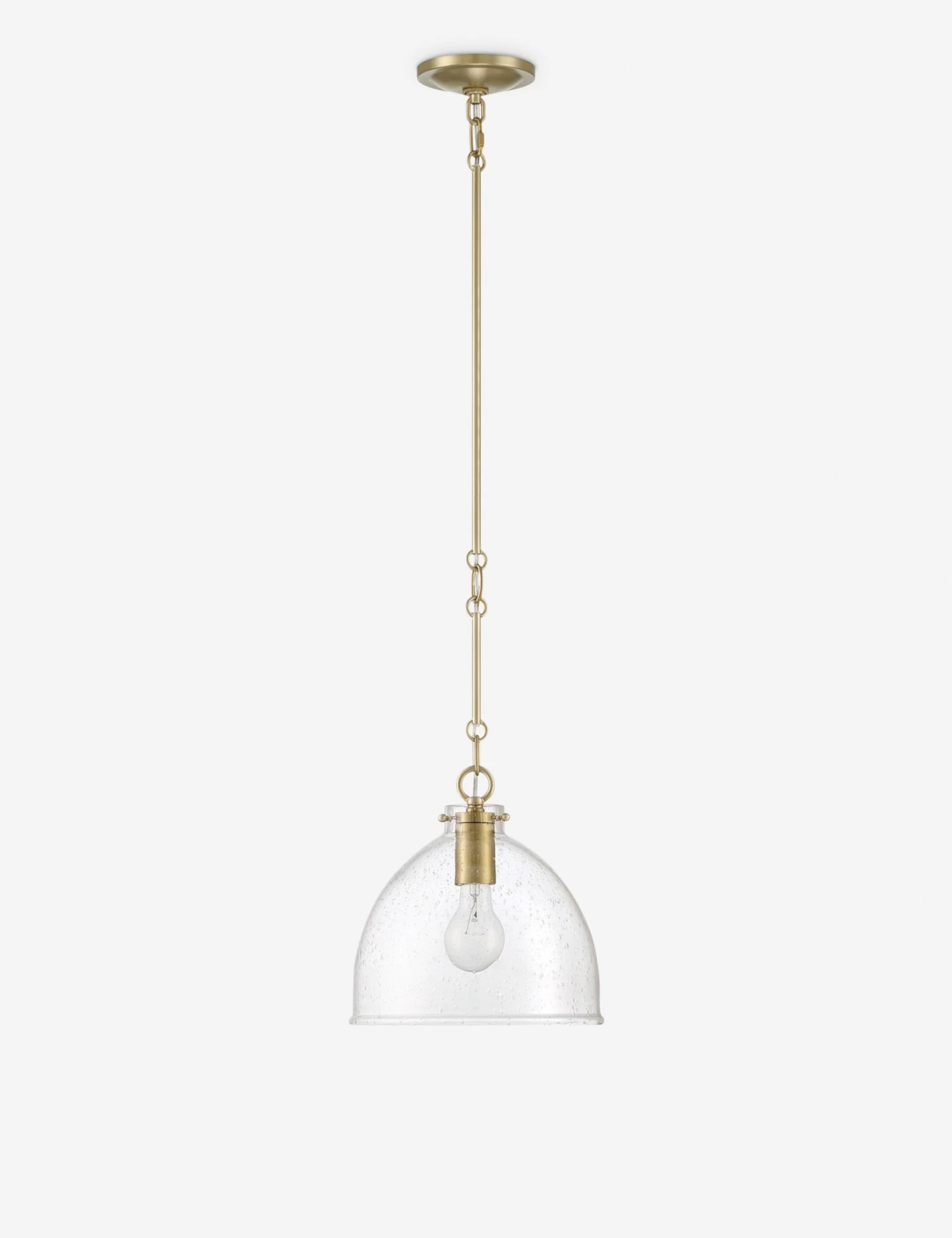 Adding some polish to your lighting design? The Lawrence pendant light features a seeded glass dome suspended by a slender stem that exudes sophistication in its lustrous finish. Whether styled as a standalone fixture or grouped in multiples above your kitchen island or counter, this pendant is a refining element with transitional appeal.