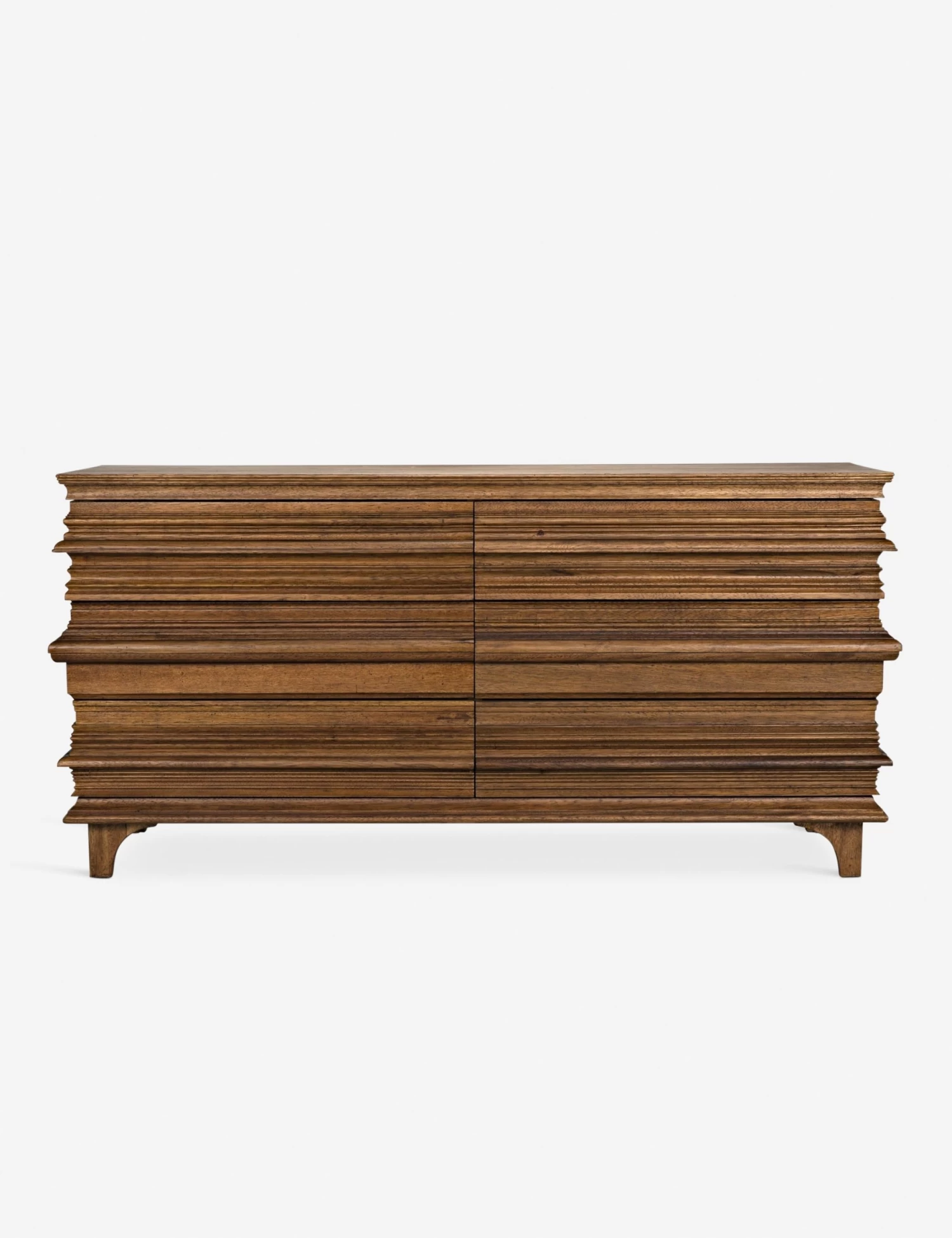 Style points abound with this intricately designed dresser, ideal for the adventurous modern bedroom. We’re especially in love with the stacked beveling on the drawers and the warm, rich tones of the wood.