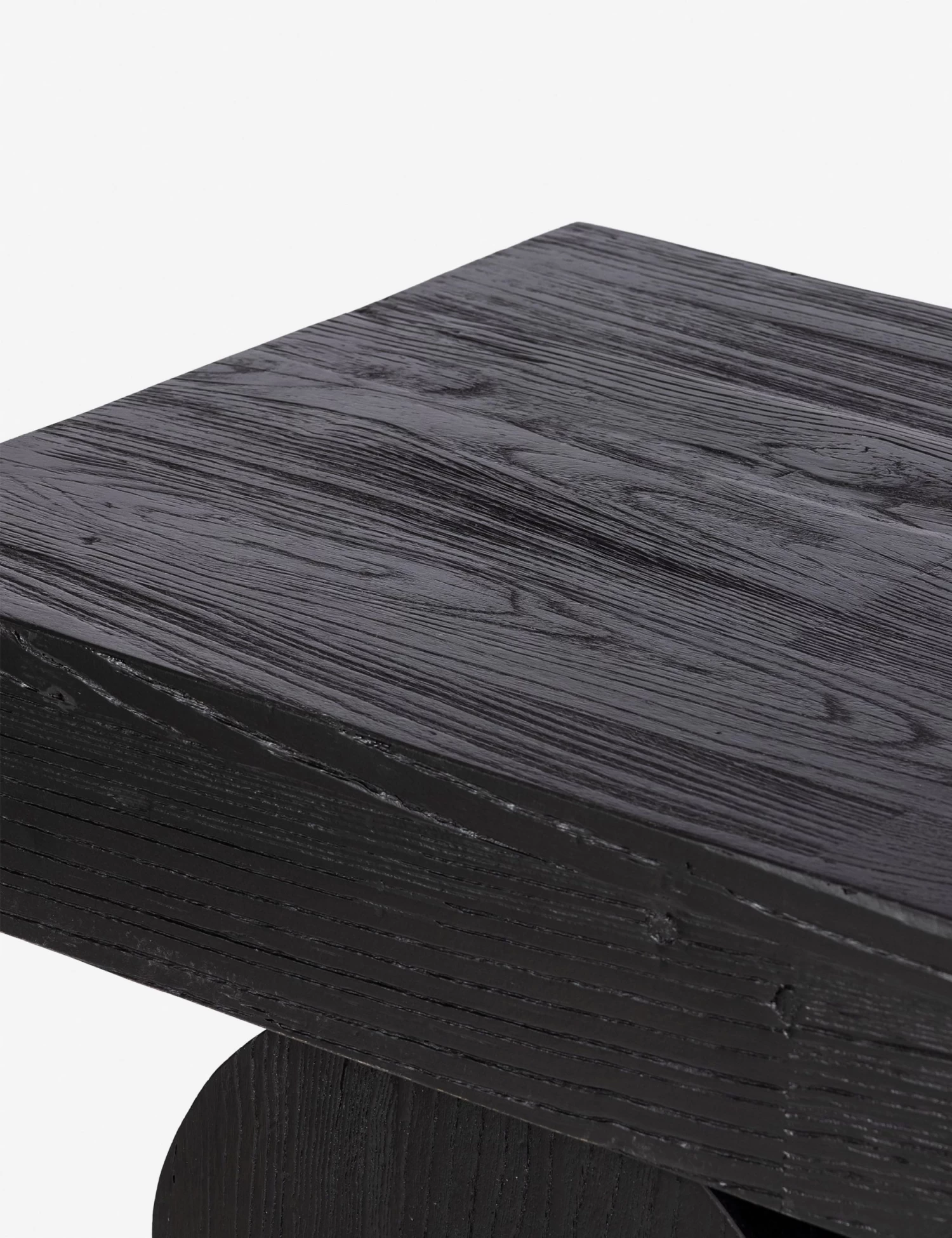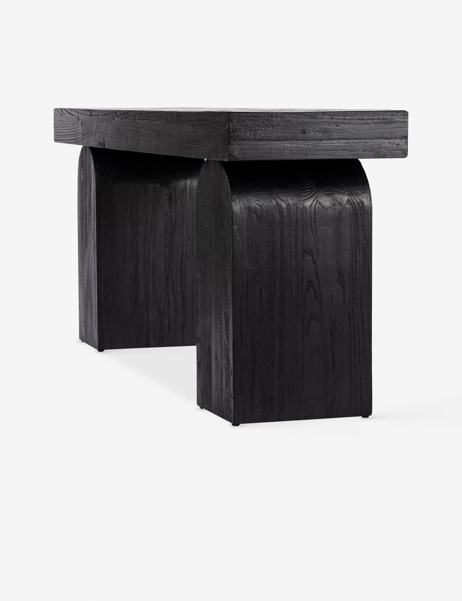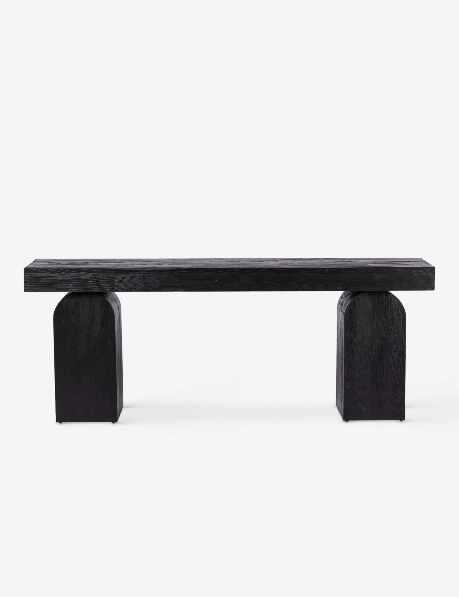 Elemental shapes create an architectural silhouette in this modern wood console table. The top is fashioned from solid elm with beautiful knotting and a rich natural grain—resting on two chunky arched legs. The black finish styles the look for impact, perfect for setting off an artful curation.