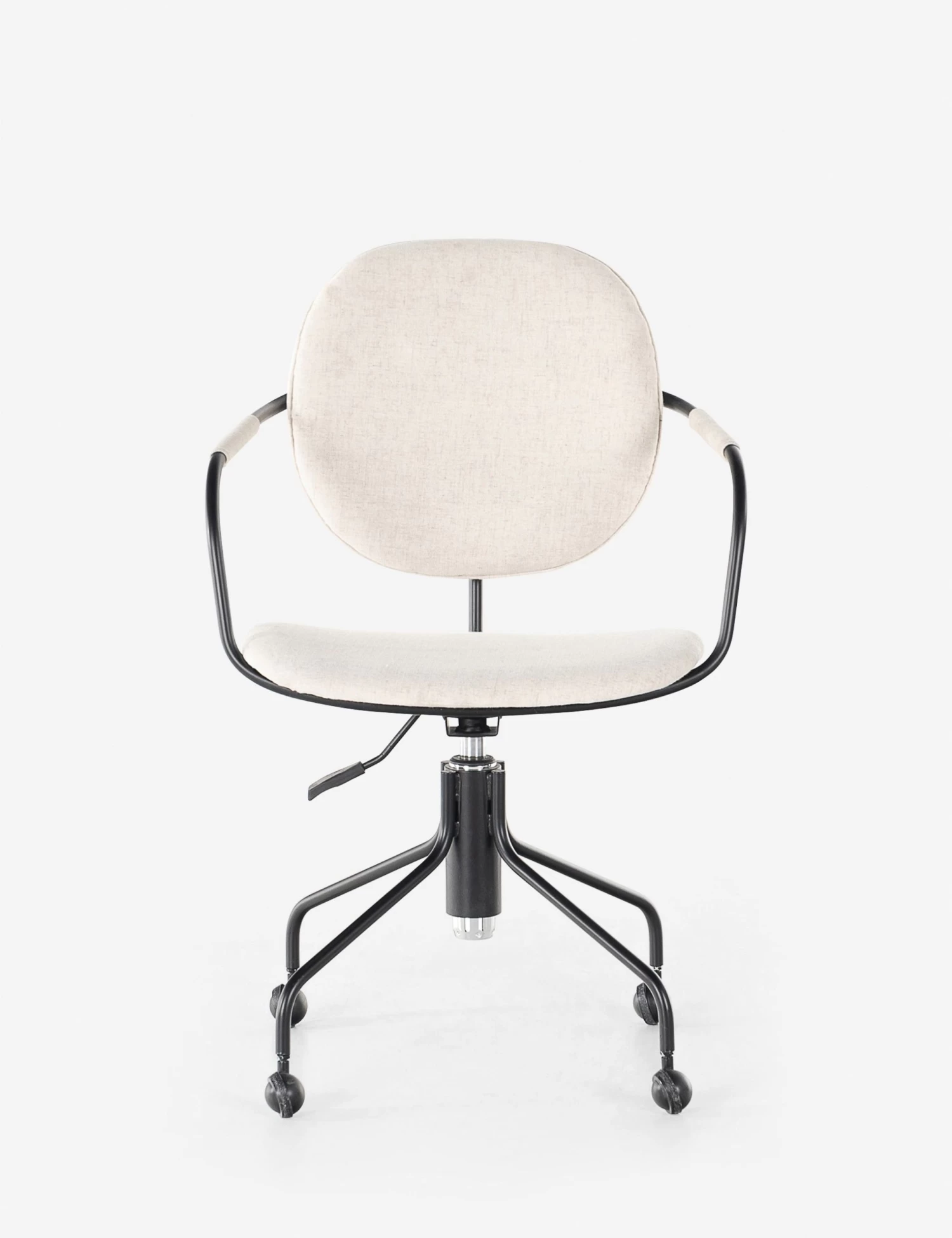 A bright, modern design with crisp, clean lines and cream-colored upholstery. We love this chair for its airy profile and versatility. Set on a black-iron swivel base with casters for practical use in a fresh, charming office space.