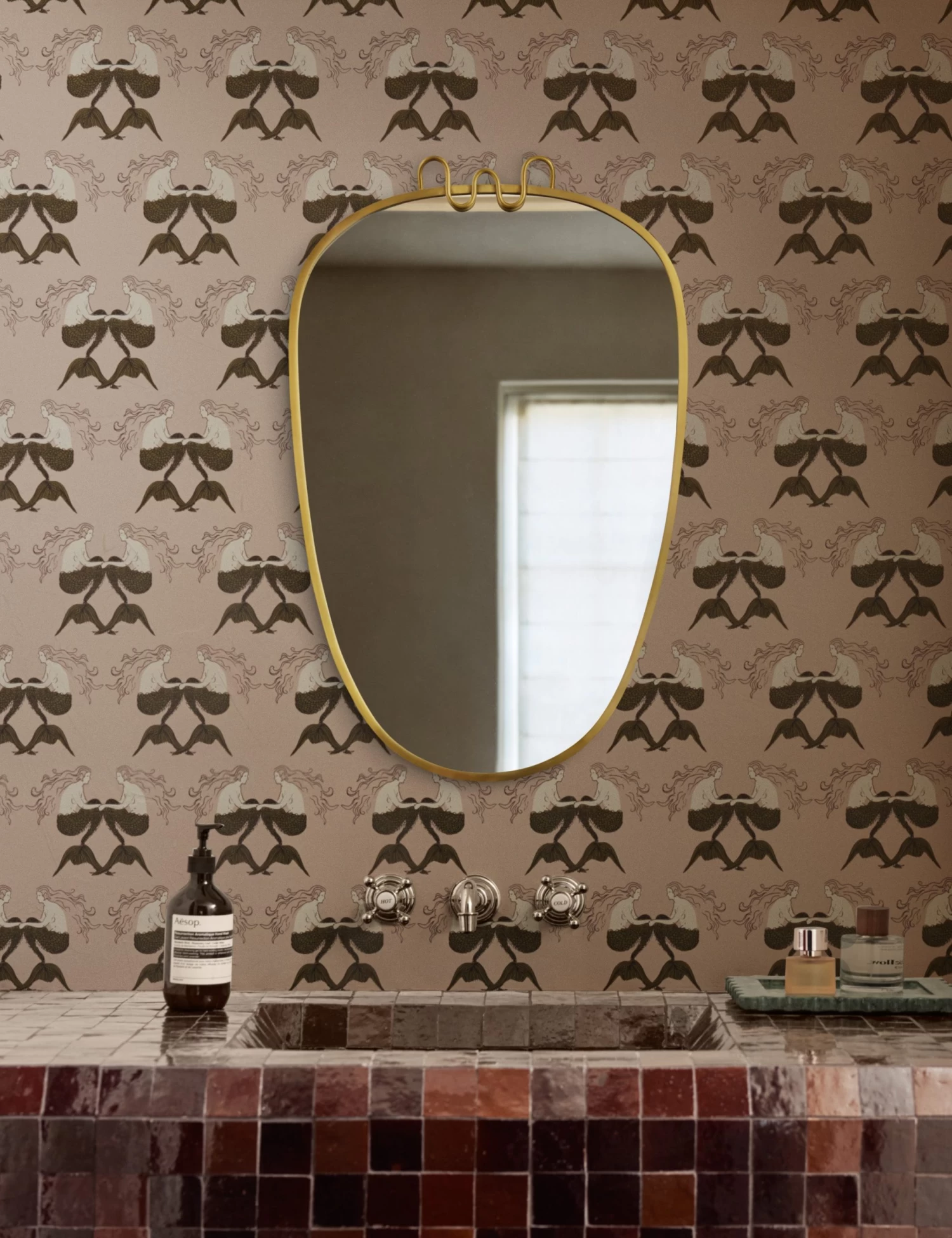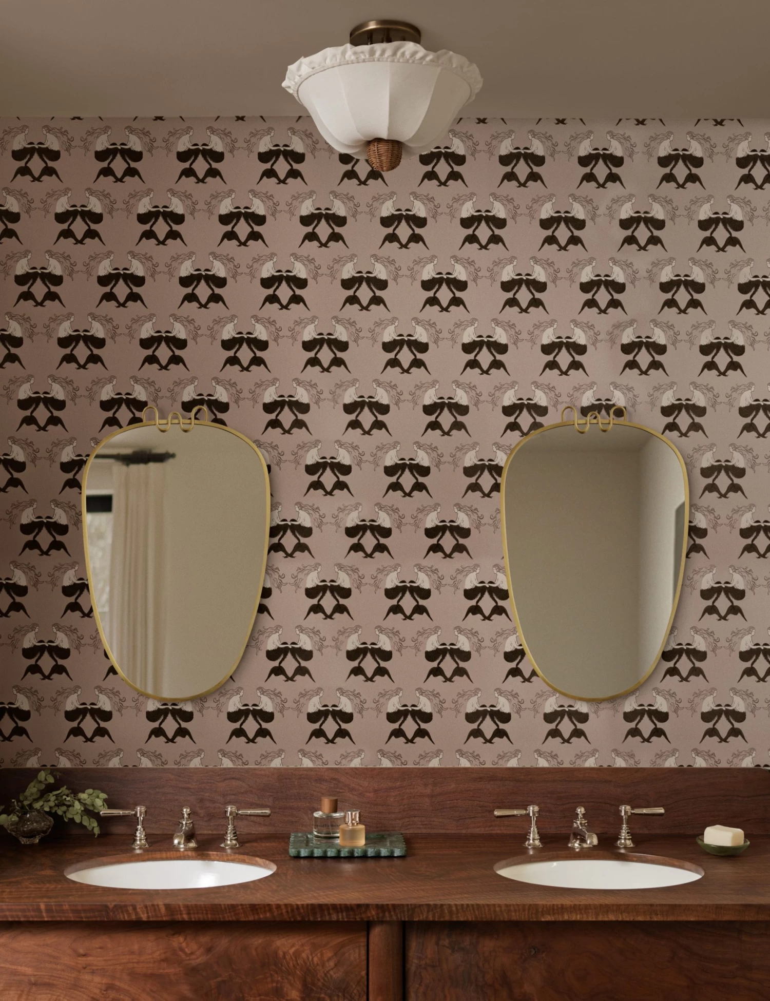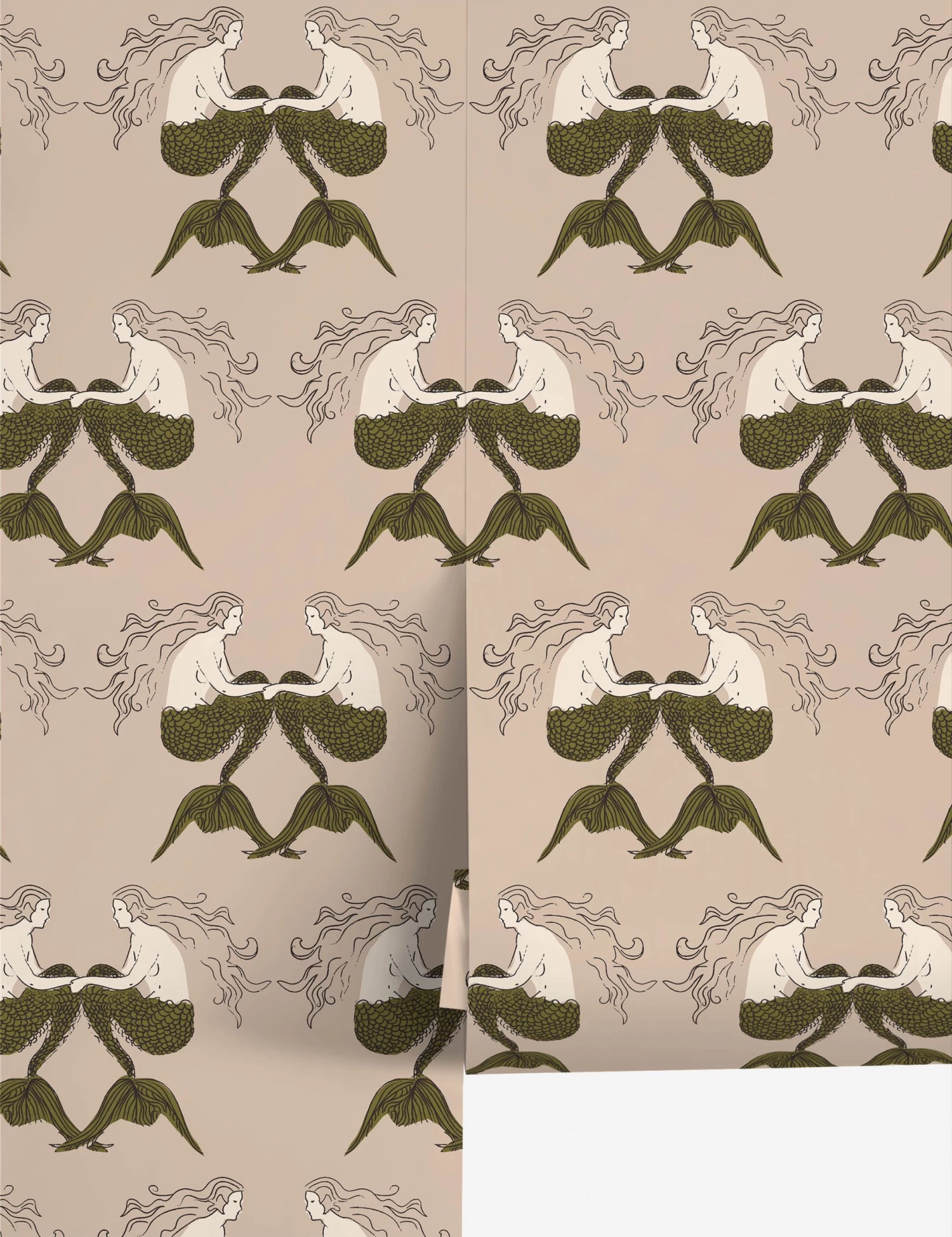 A mirrored mermaid motif brings whimsy and symmetry to the Meri wallpaper pattern. The intricate linework and stylized figures give this pattern a bold, graphic feel. This wallpaper is from our exclusive Sarah Sherman Samuel collaboration and features all the trademarks of her warm, edited style.