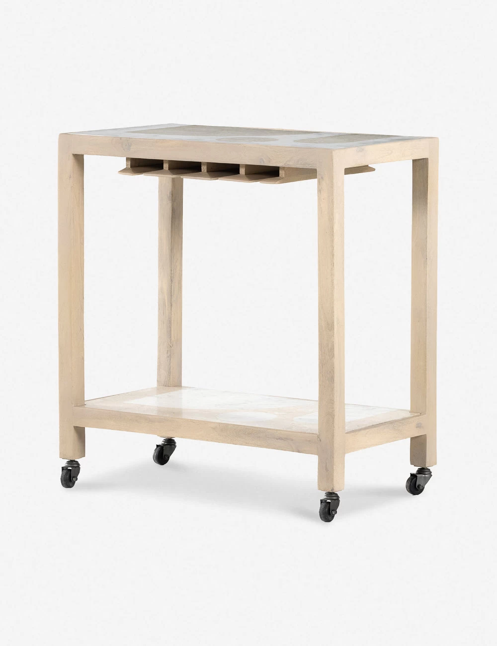 This wheeled bar cart brings a luxe touch to a lounge or open-plan space. The light-finished mango wood frame features white marble shelves with inlaid shapes for stylish intrigue. The tonal appeal of this cart looks stunning decked out in your favorite cocktail and barware essentials.