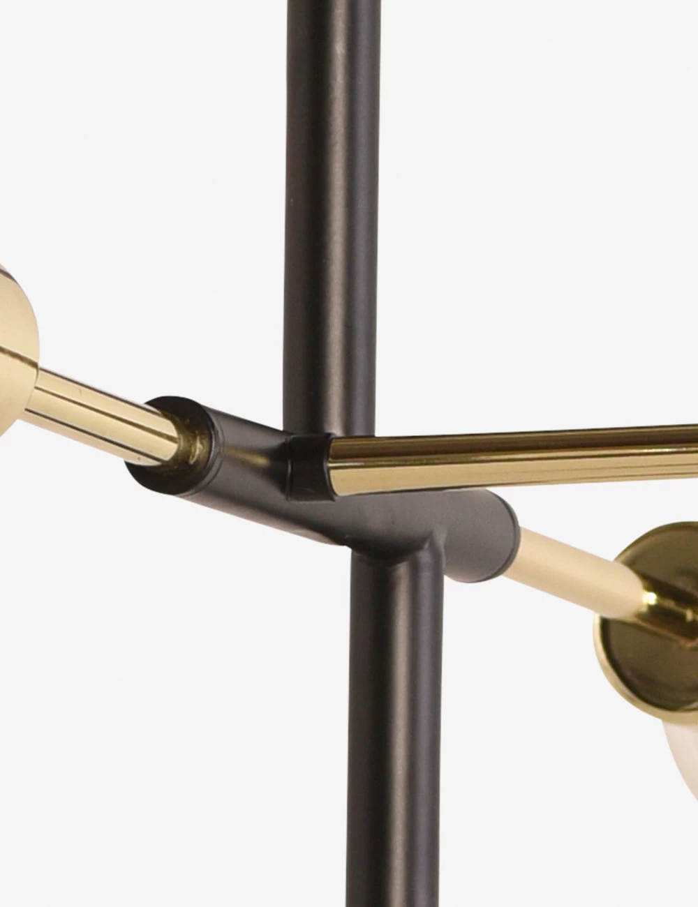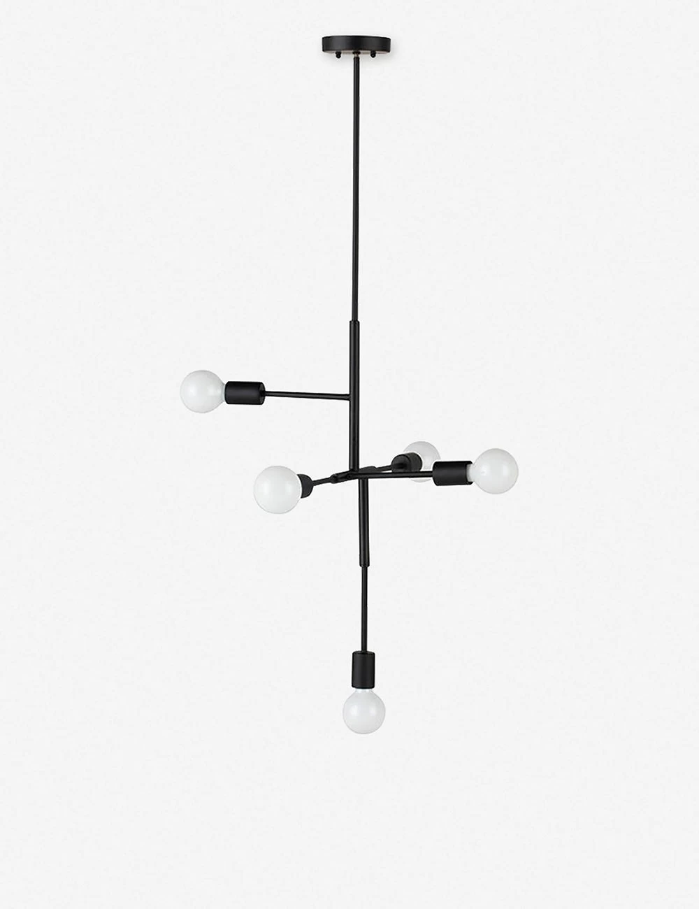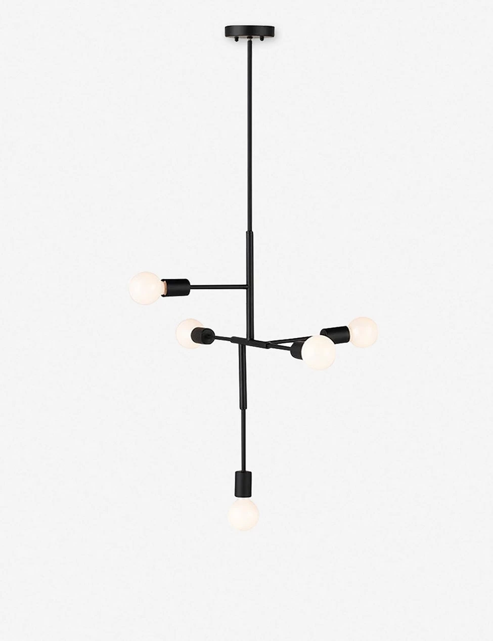 This angular lighting display features five individual orb bulbs that interject at different planes for a highly architectural, modern feel.
